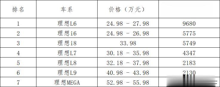 理想汽车产品矩阵覆盖24.98万—55.98万元中高端市场,各车系销量表现如下:L6(24.98万—27.98万元)交付9680辆,i6(24.98万—26.98万元)交付5775辆,i8(33.98万元)交付5749辆,L7(30.18万—35.98万元)交付4347辆,L8(32.18万—37.98万元)交付2183辆,L9(40.98万—43.98万元)交付2130辆,MEGA(52.98万—55.98万元)交付1903辆。以各车型指导价中值为基准,按当月销量加权平均计算,理想汽车平均单车价格约32万元。