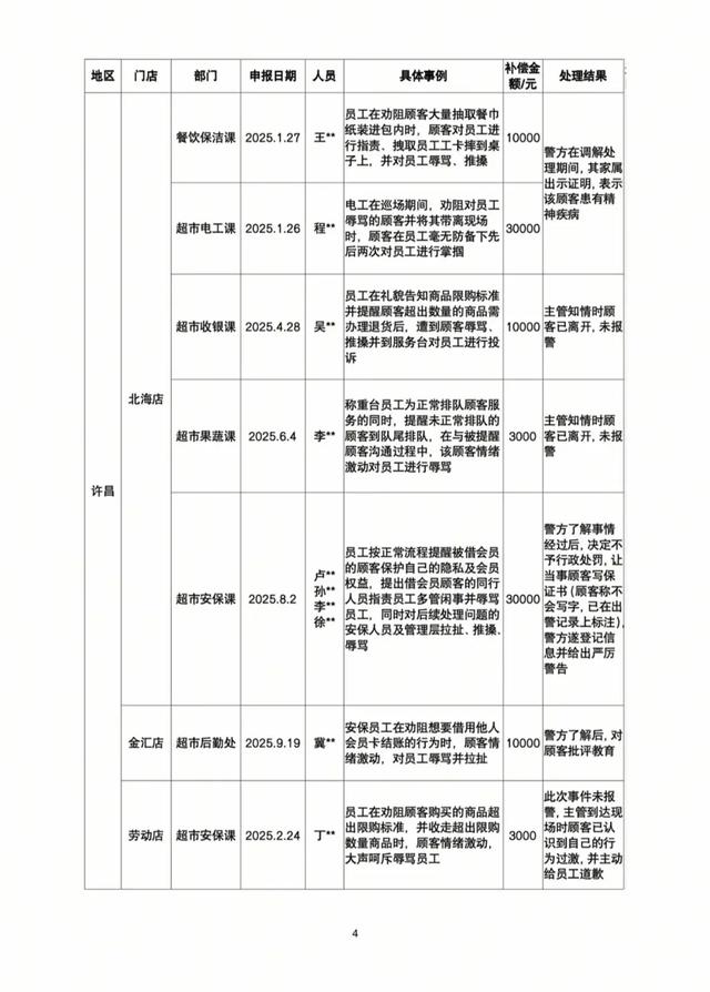 在这份长长的补偿名单里,有一个案例特别让人揪心,也特别解气。事情发生在2025年1月26日,地点在许昌北海店。那天,超市的一位电工程某某正在巡场,本来是去劝阻一位正在辱骂其他员工的顾客,想着把人带离现场,息事宁人。谁成想,这顾客是个“硬茬”,趁着这位电工师傅毫无防备,抬手就是两个大耳光!