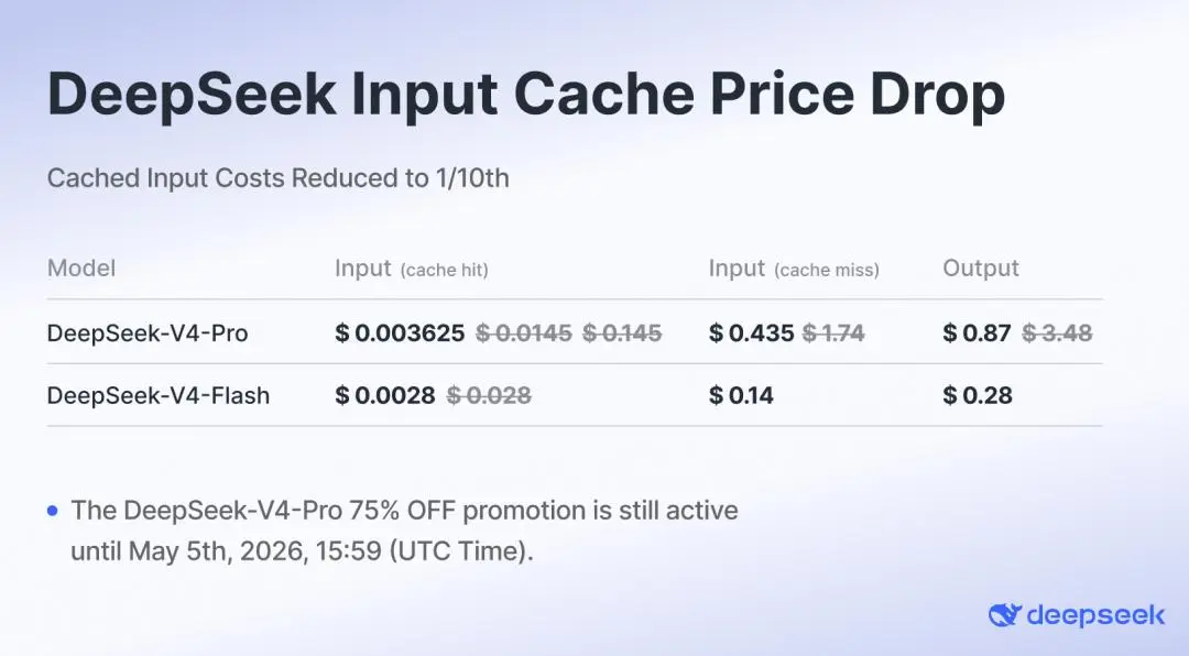 4月26日,全系API输入缓存命中价格直接降至首发价的1/10。