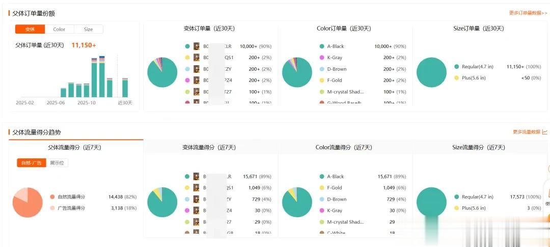 (图:产品父体下变体流量份额和订单份额对比图)