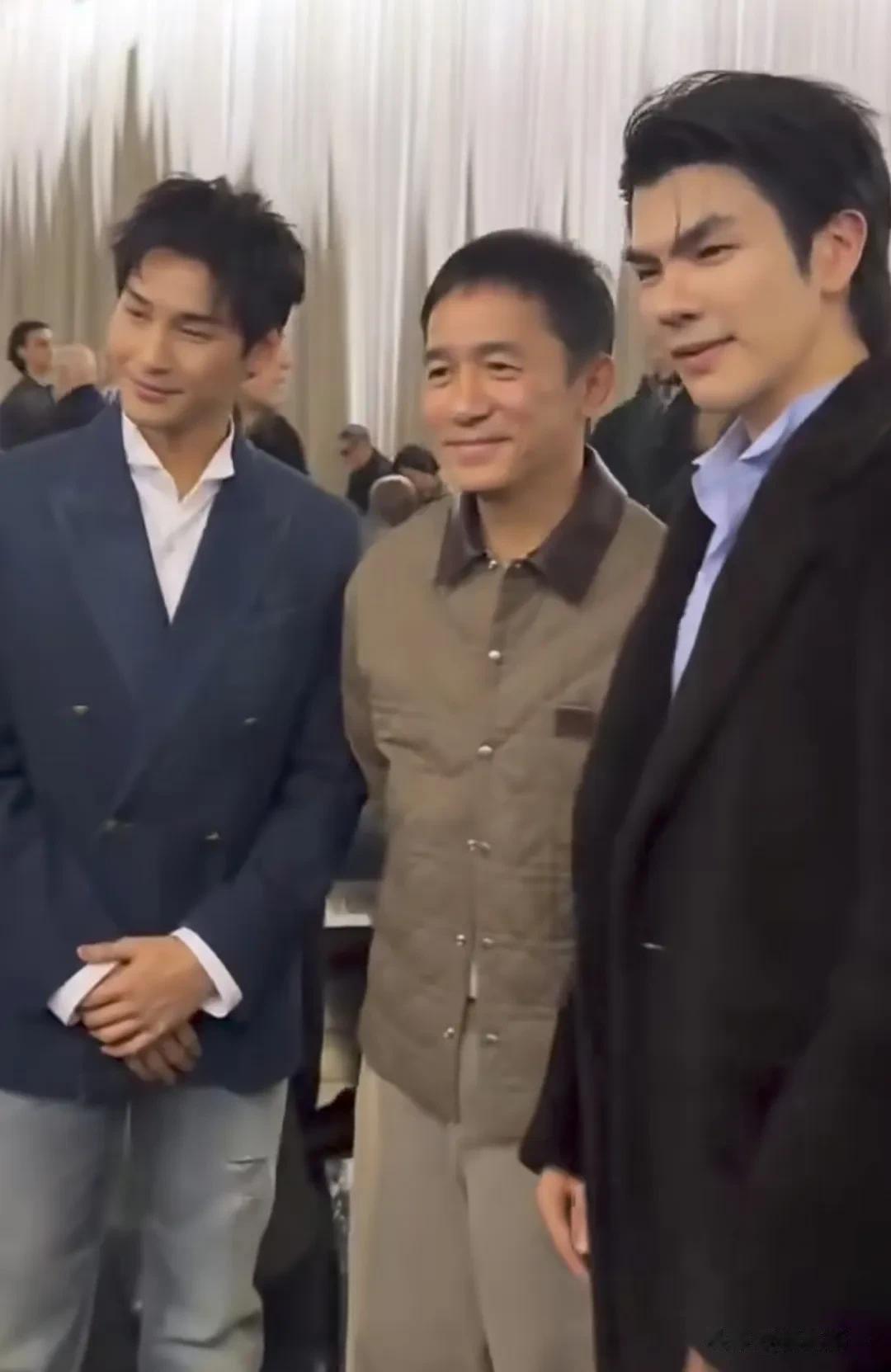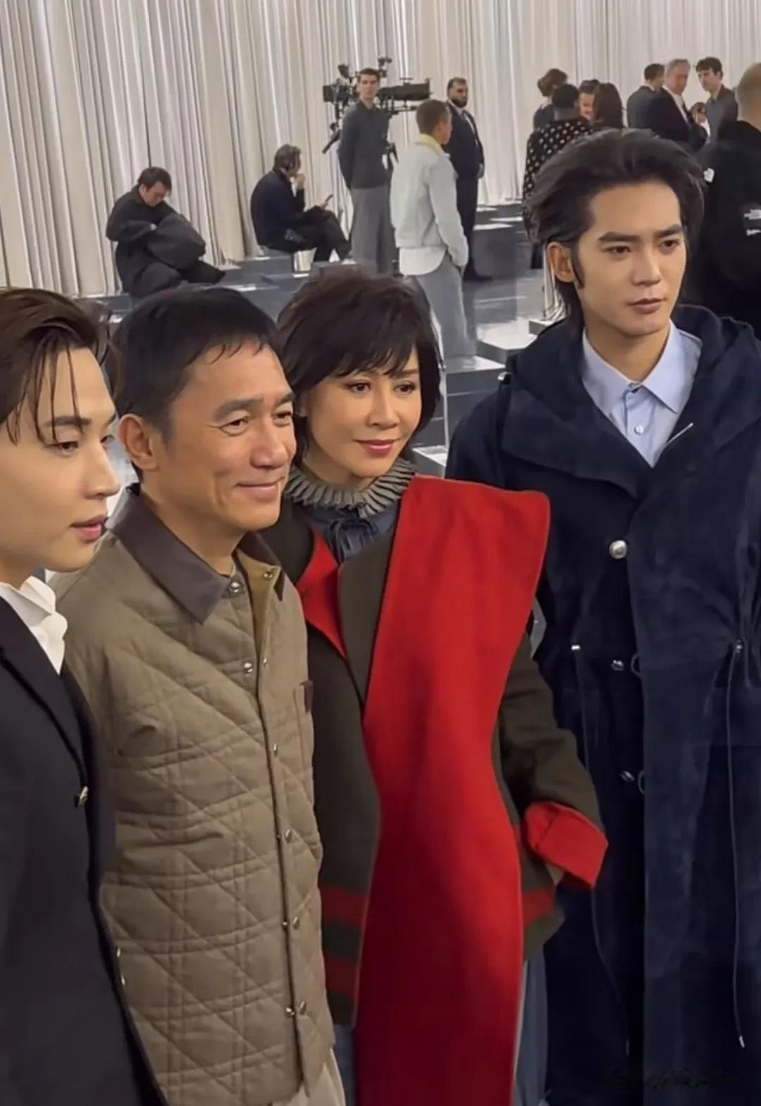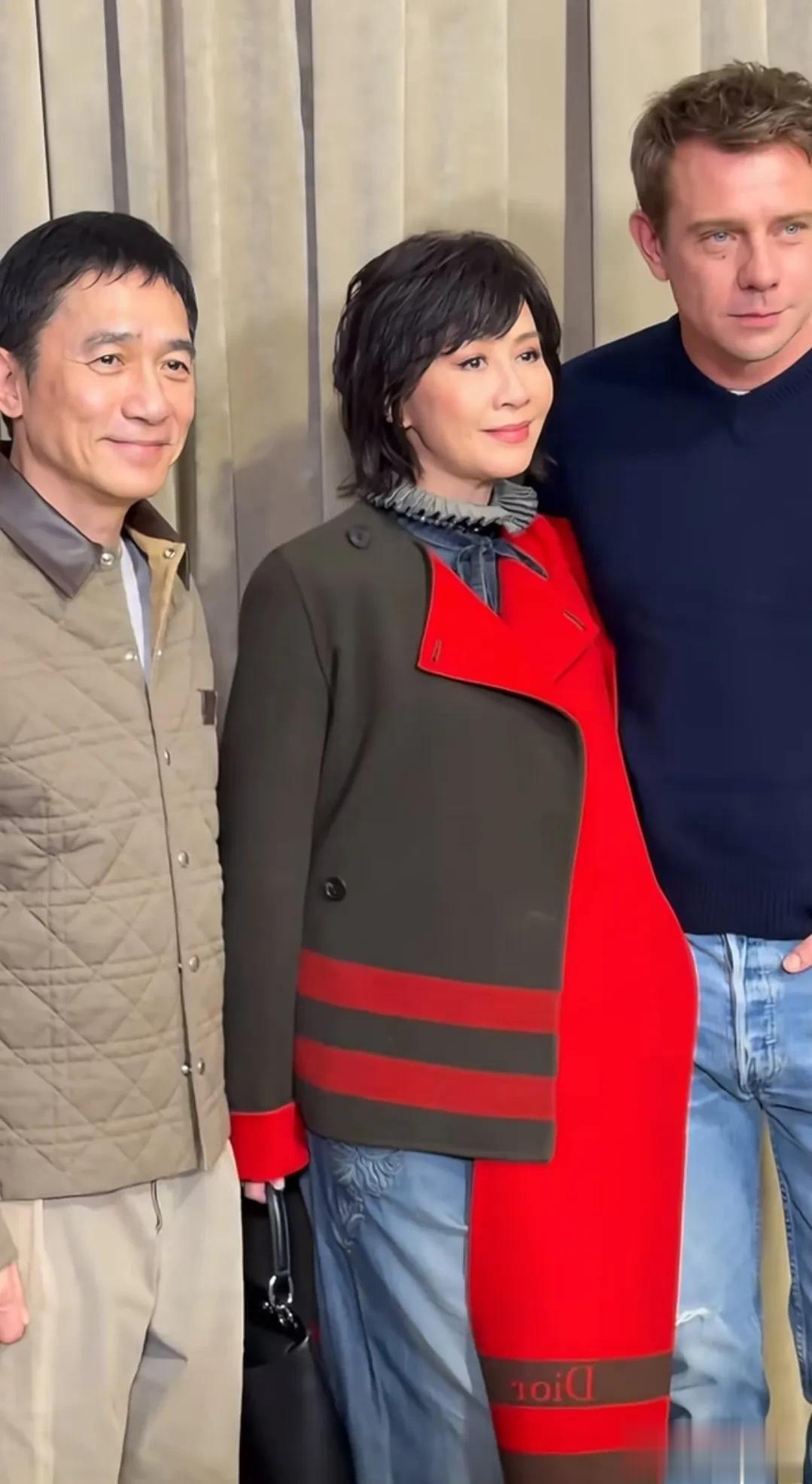 实在太时尚把一旁穿着卡其色夹克的梁朝伟都衬成老头了!