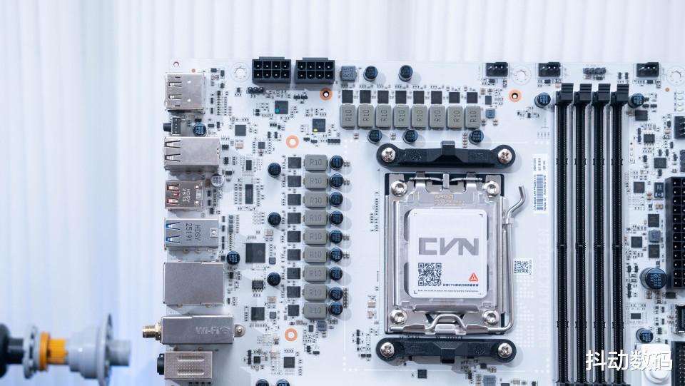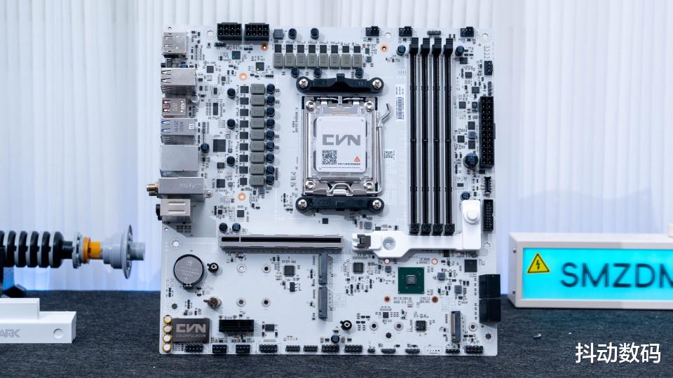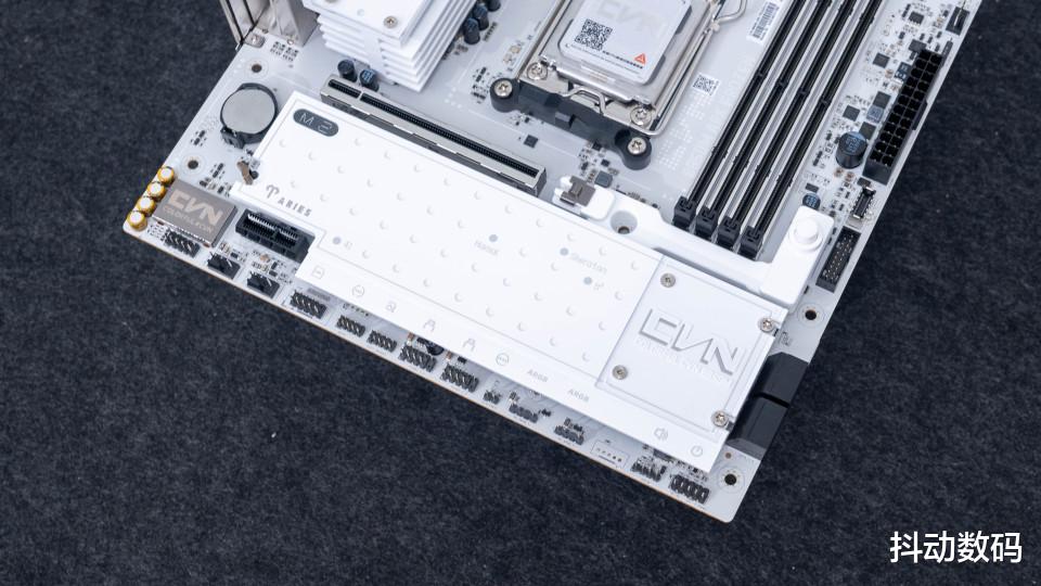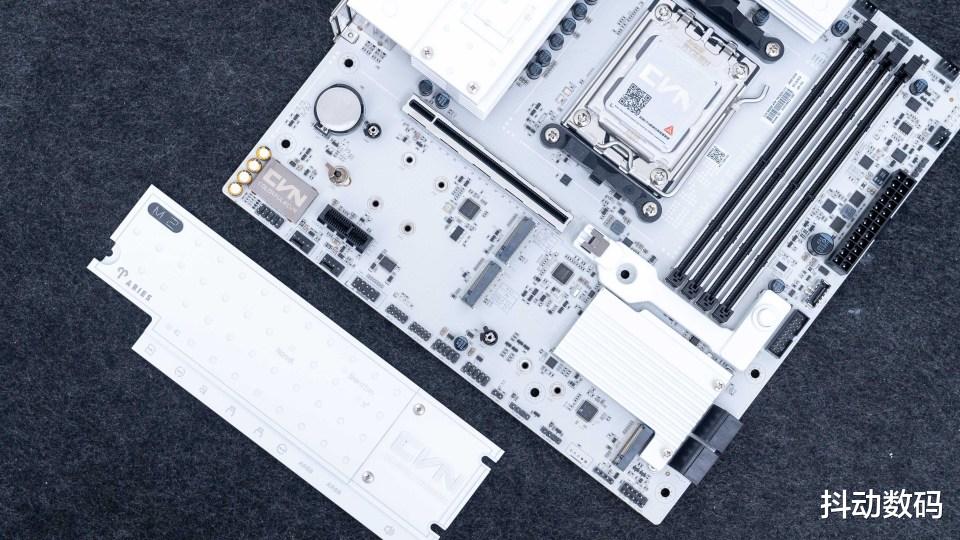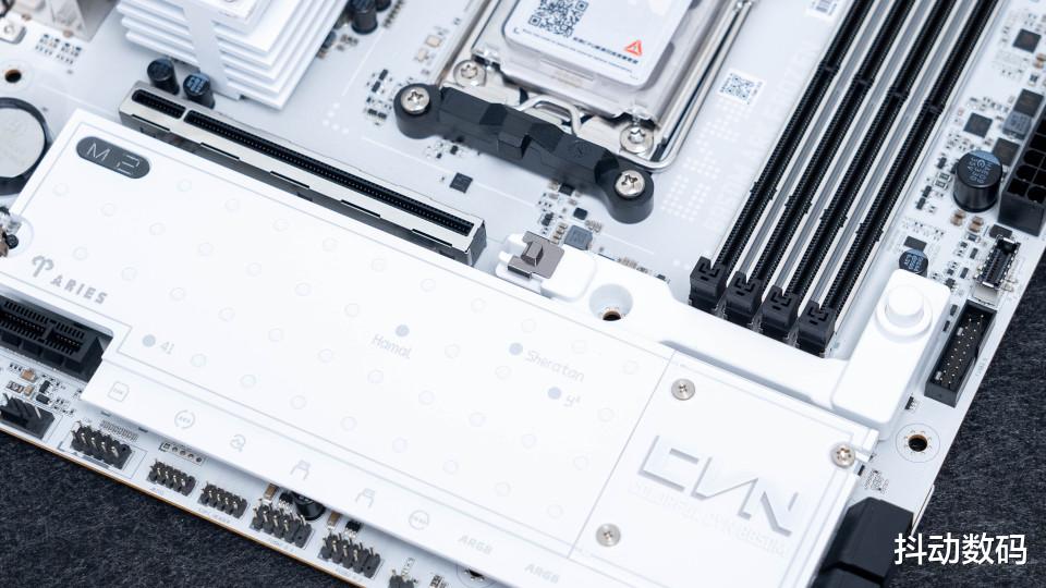 CVN B850M ARK FROZEN V14采用独特的白色PCB基底,搭配纯白散热装甲与黑色的内存插槽与元器件,形成鲜明对比。