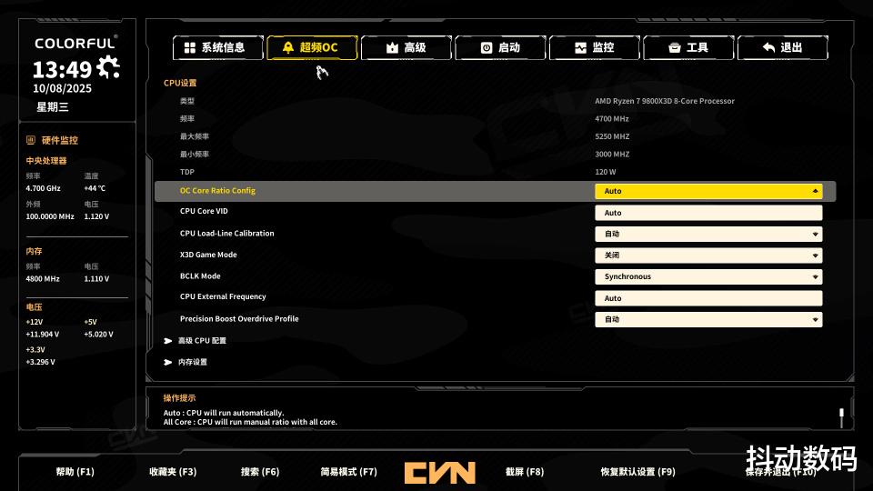 OC设置界面也很清爽,可以设置处理器倍频,处理器电压等。这里还有一键开启X3D Game Mode设置,对于X3D处理器支持的还是非常友好的。