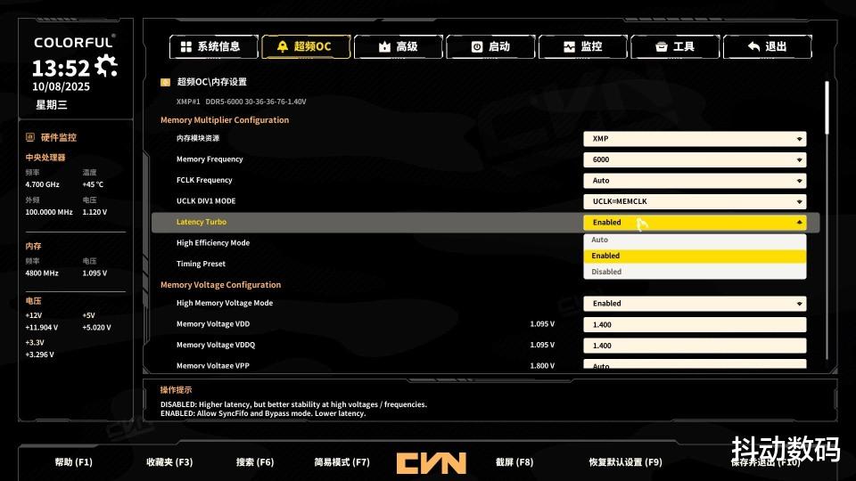 此外七彩虹也提供内存延迟选项以及高效模式选项,手动开启高效模式会根据提示弹出这个设置可能会影响系统稳定性。