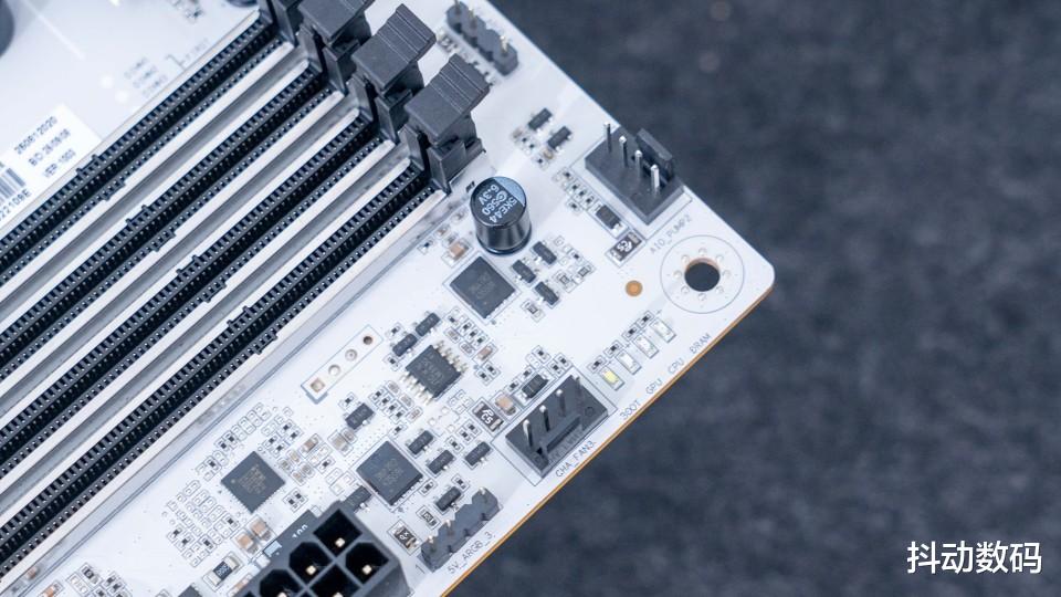 说是纯白主板,但是也没有给到彻底的白色。整体像是内存插槽、各种供电接口、风扇接口都还是黑色设计的。四内存插槽设计,最大支持8400MHz频率。
