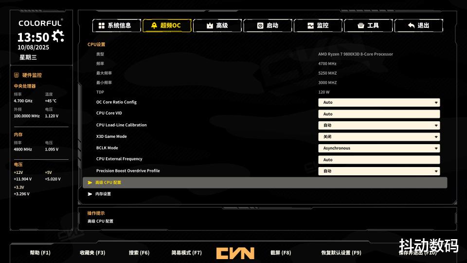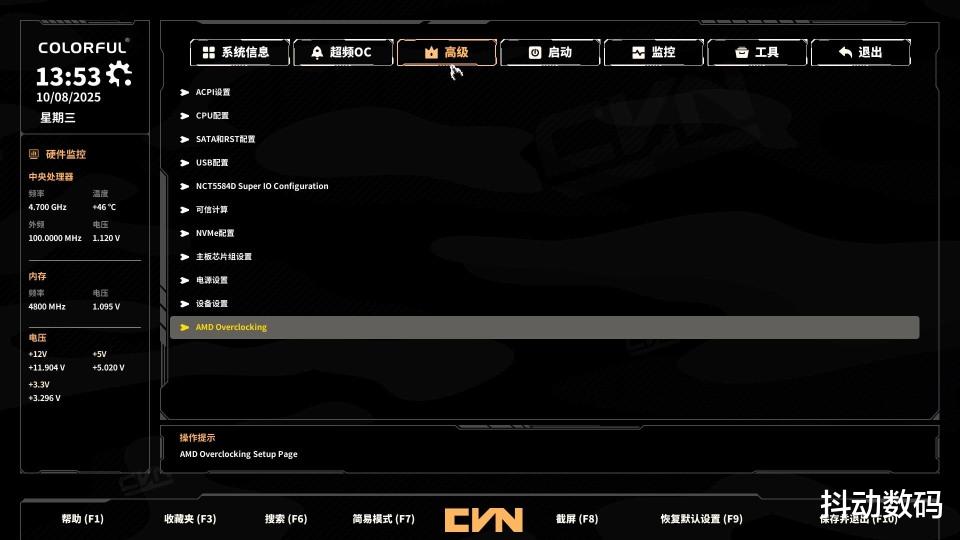 内存设置菜单,选项丰富。但是也不建议AMD玩家有过多复杂操作,入手选一套6000MHz CL28或者6400MHz CL28的内存套条简单开启EXPO或者XMP就好了。但是七彩虹的内存设置功能还是非常丰富的,比如UCLK DIV1模式以及与内存有关的电压调节项目也在该页面中可以手动设置。