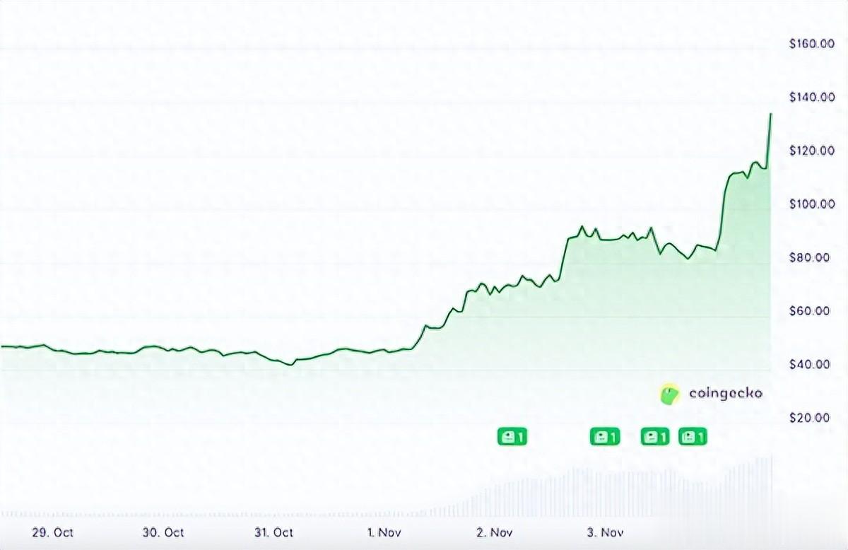 7天之内DASH价格从41美元开始一路上涨,即便11月3日大跌期间也没受到影响,11月4日DASH最高上涨至近140美元,达到原来价格的3倍之余。