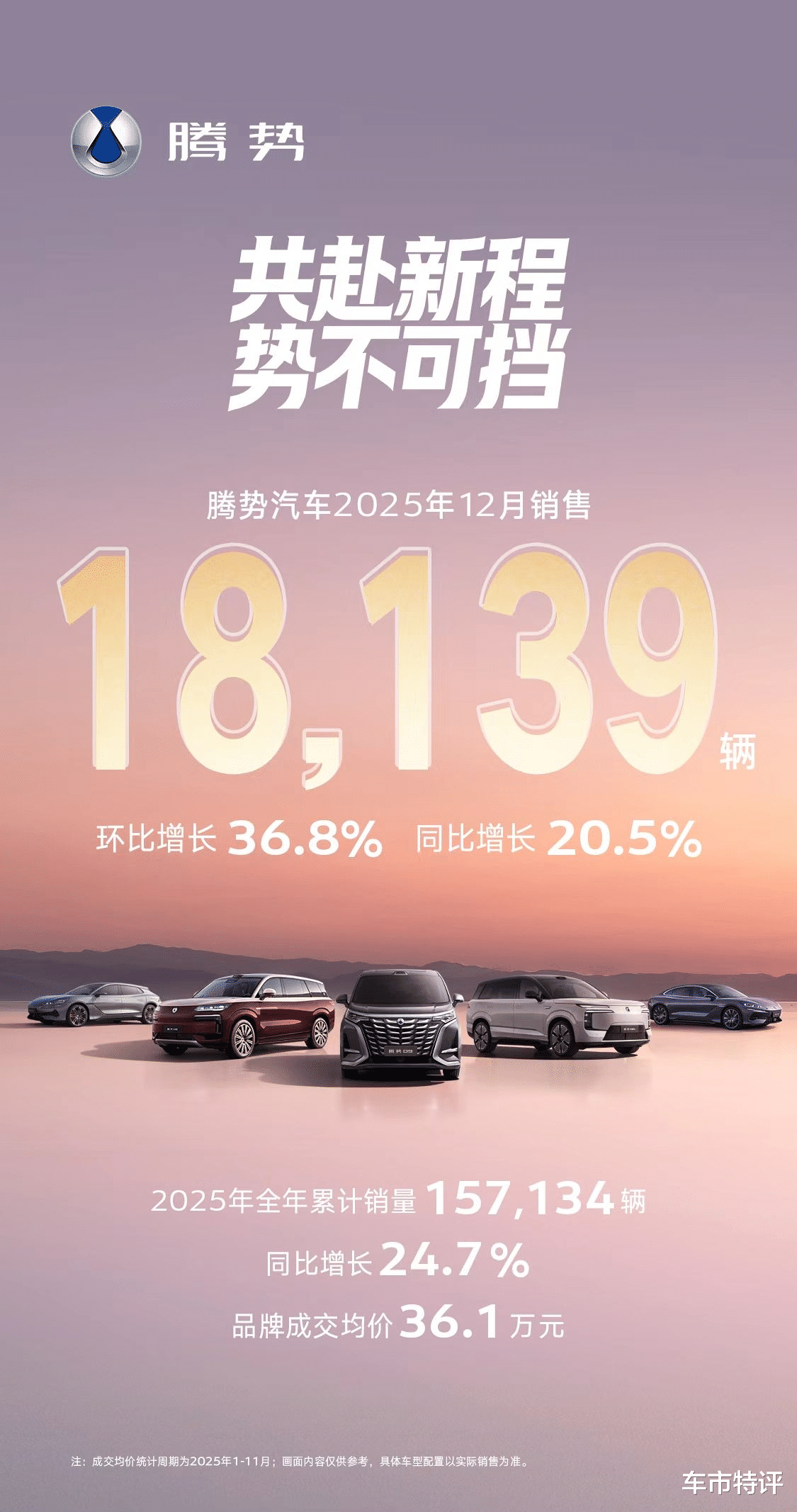腾势汽车2025年累计销量超过15万辆,达到157134辆,同比增长24.7%,在收官之战的12月,腾势交出了18139辆,环比增长36.8%,同比增长20.5%。
