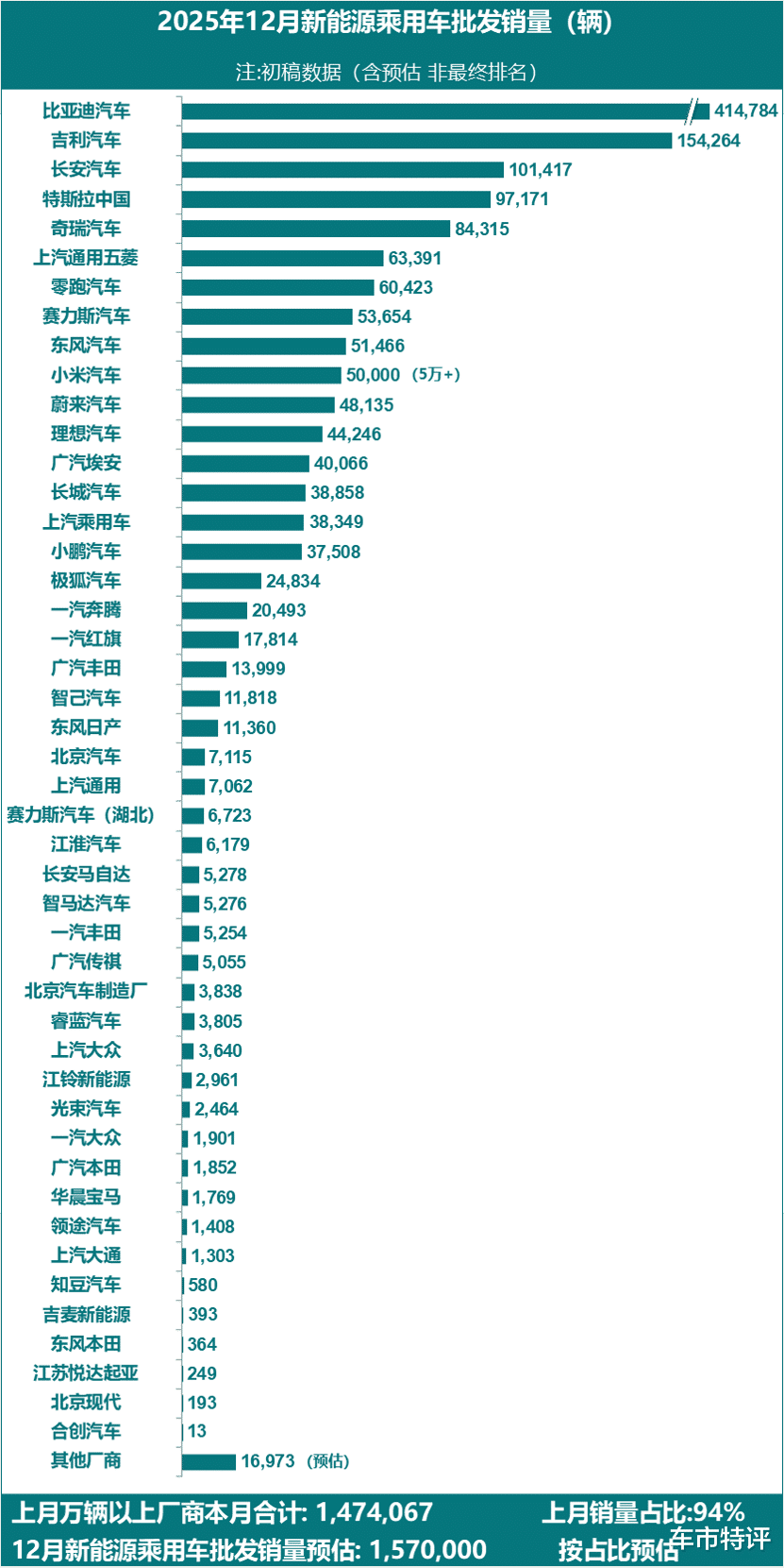 日前,乘联分会也公布2025年12月新能源乘用车厂商批发销量:全国157万辆,同比增4%;2025年全年累计批发1533万辆,同比增25%。比亚迪以41.48万辆居首,吉利、长安分列二、三,特斯拉中国以9.72万辆的成绩排名第四,小米以交付破5万辆的表现首次进入前十。