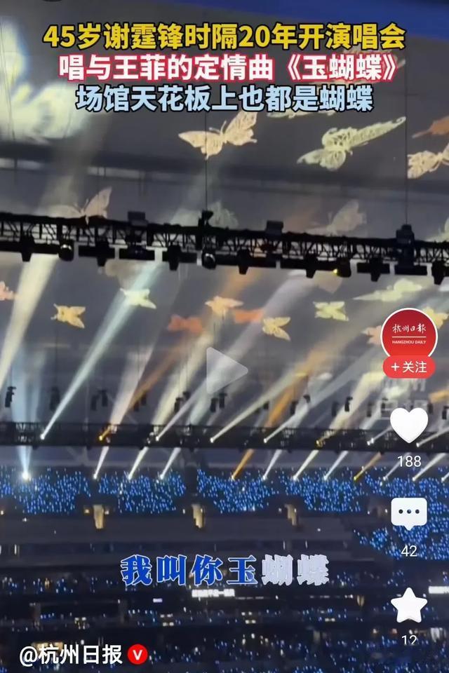 当谢霆锋含泪演唱写给王菲的定情歌曲《玉蝴蝶》时,整个舞台的上空都是翩然的蝴蝶,王菲也是站起来边听边陶醉起舞。