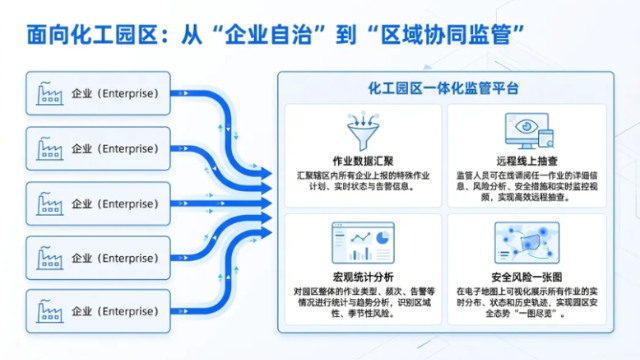 针对化工园区,公司打造的区域协同监管平台打破“企业自治”壁垒,实现辖区内所有企业特殊作业数据、人员定位数据的汇聚共享。通过安全风险一张图、远程线上抽查、宏观统计分析等功能,让园区监管实现“一图尽览、精准管控”,助力监管部门识别区域性、季节性风险,提升协同防控能力。