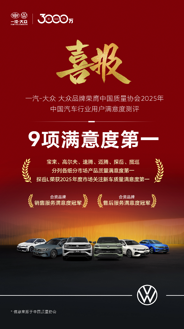 近日,中国质量协会正式发布2025年中国汽车行业用户满意度测评(CACSI)结果,一汽-大众大众品牌荣膺2025年中国汽车行业用户满意度测评9项满意度第一:旗下六款主力车型宝来、高尔夫、速腾、迈腾、探岳、揽巡分列各细分市场产品质量满意度第一,大众品牌斩获合资品牌销售服务满意度、售后服务满意度冠军,展现出强大的市场竞争力与用户认可度。