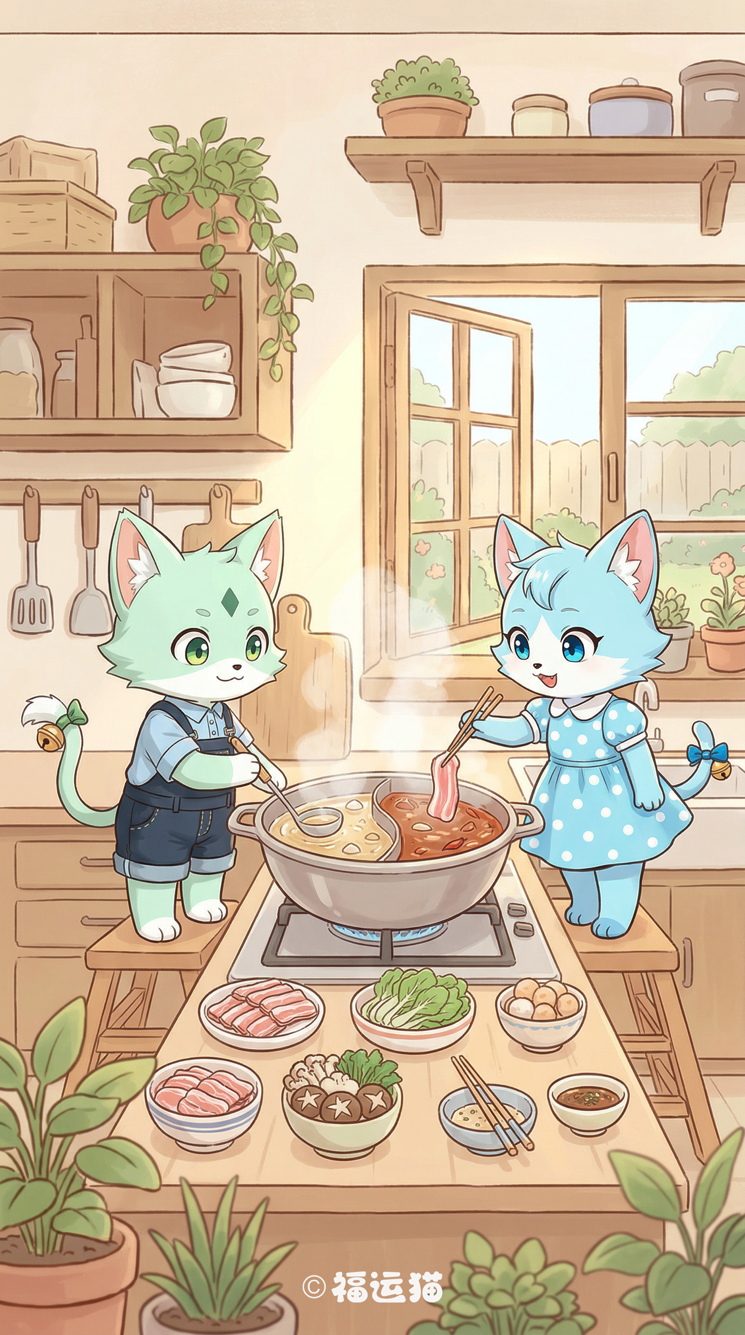 蔚珊踩着小板凳,握着长柄勺子,认真地从红汤里盛出一勺毛肚;森泽站在另一侧,长筷子夹起一片肉,在红汤里涮了几秒,放进蔚珊碗里。