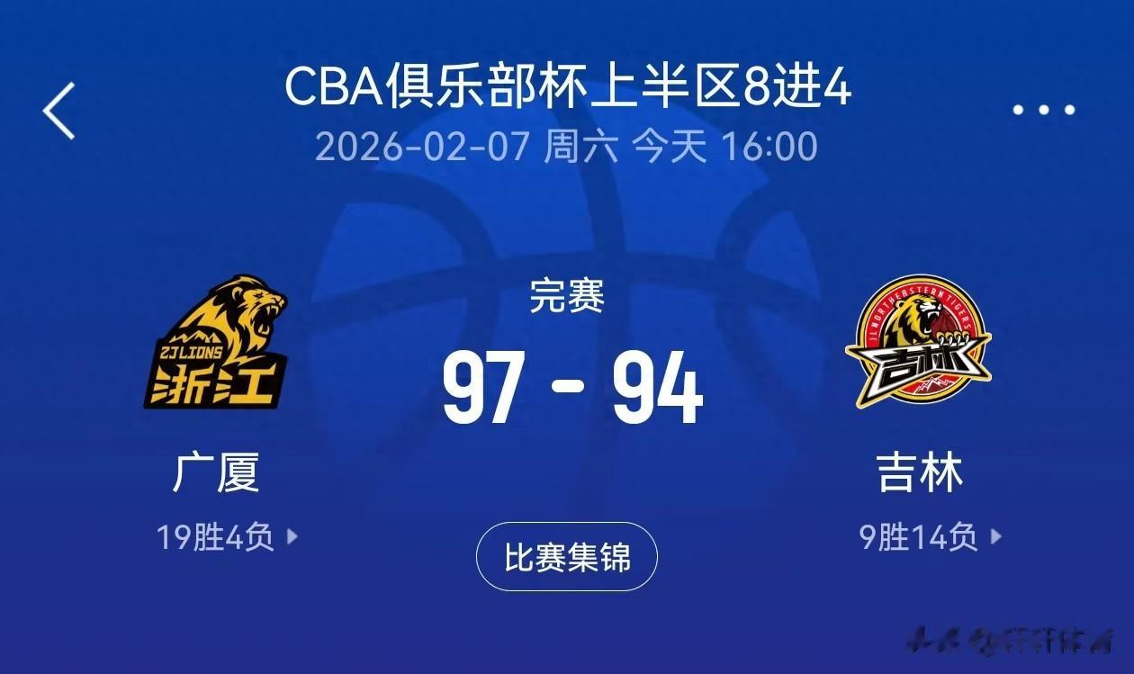 在今天结束的CBA俱乐部杯赛八进四的比赛中,浙江广厦凭借外援塔克的48分11篮板,助浙江男篮15分逆转吉林男篮,浙江男篮凭借本场比赛的胜利成功,晋级俱乐部杯赛四强,本场比赛非常具有戏剧性,吉林男篮全场领先就在球迷都认为,吉林男篮将继续扮演“巨人杀手”的时候,最后是时刻被浙江男篮以97-94逆转取胜,吉林男篮遗憾止步杯赛八强。
