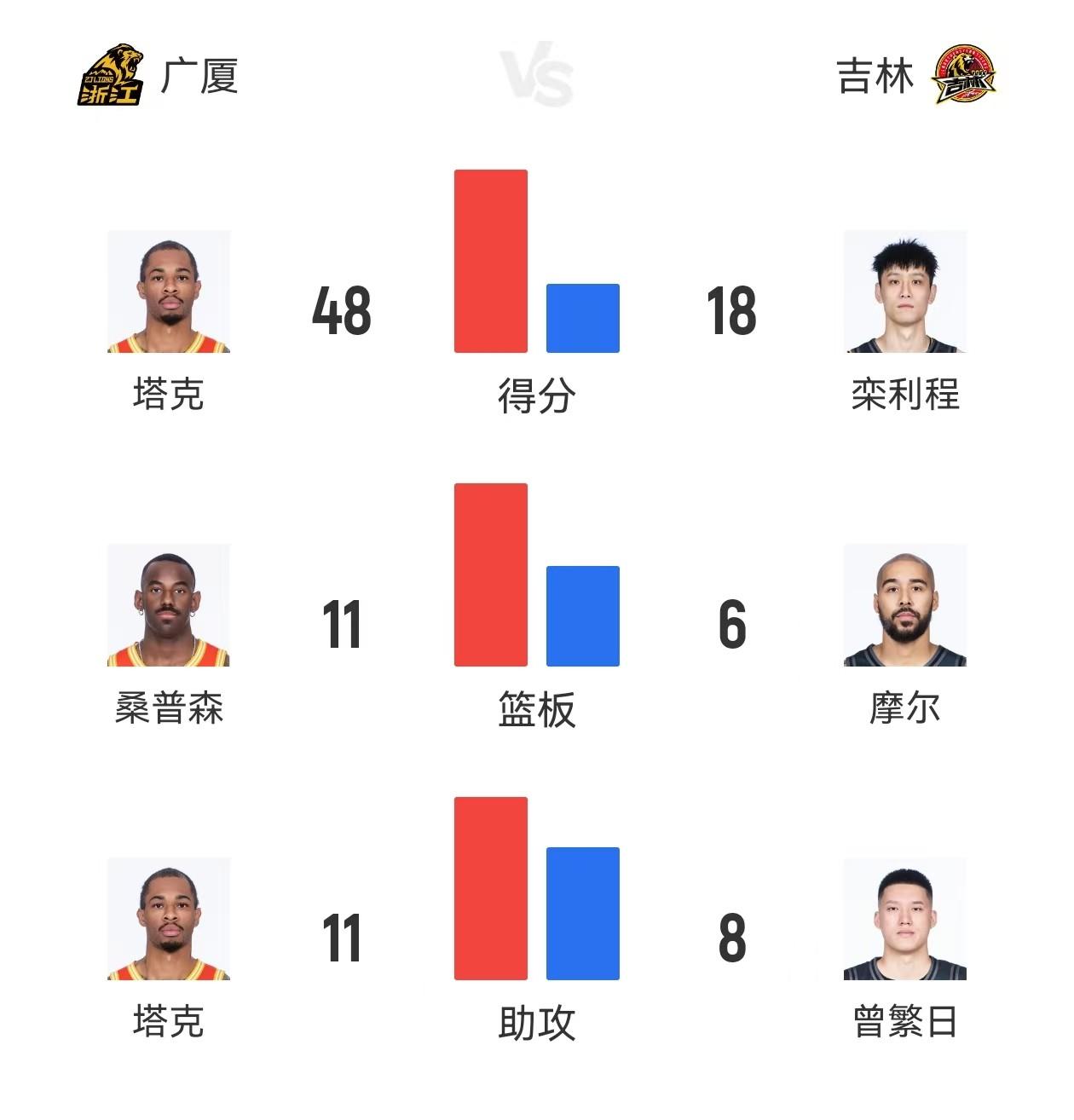 反观浙江男篮球队在缺少胡金秋以及朱俊龙的情况下,球队外线手感冰冷三分球全场19投仅有2中,本土球员合计仅得到了13分,然而全队低迷的表现缺成全了外援塔克,全场塔克22投16中高效拿下了48分6篮板11助攻的封神表现,下半场更是独揽了25分同时比赛末节,塔克的连续关键进球帮助球队紧咬比分,最后时刻两罚全中帮助球队锁定胜局,球队另一名外援桑普森也有20分11篮板的贡献。