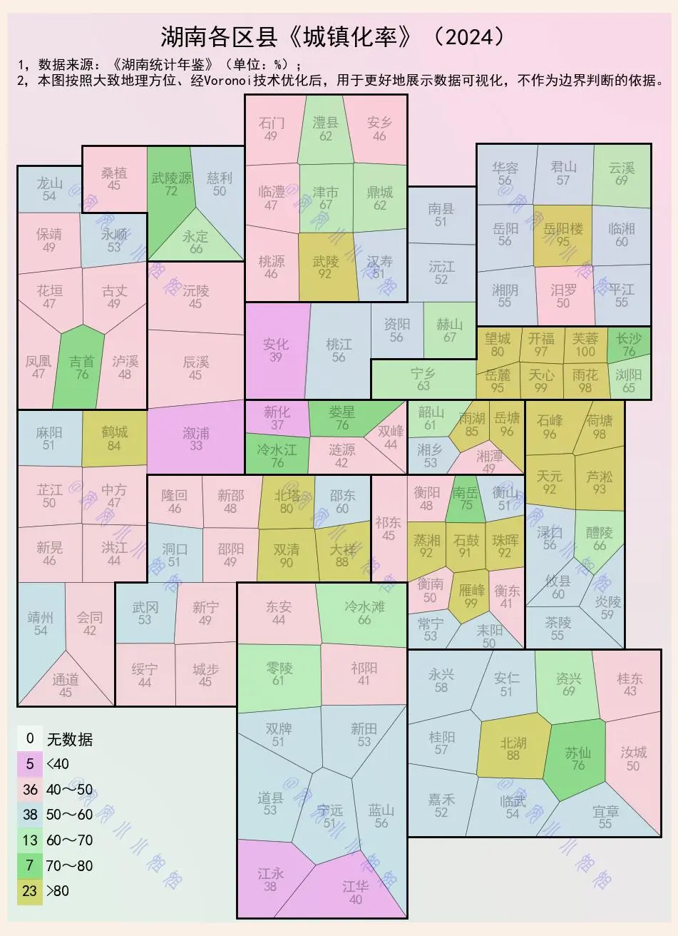 分析湖南各区县 2024 年的城镇化率数据,能帮我们清晰看到全省 14 个市州、122 个区县的发展梯度,读懂不同区域的城乡结构差异,也能为理解湖南的区域发展格局提供最直观的民生视角。