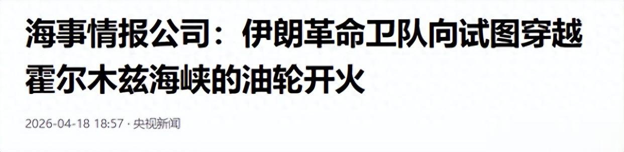 “伊朗革命卫队开火,印度油轮被炮击了!”央视新闻报道称,海事情报公司“油轮追踪者”网站在4月18日发文,两艘试图穿越霍尔木兹海峡的印度船只被伊朗伊斯兰革命卫队海军逼退,其间出现开火情况。其中一艘是悬挂印度国旗的超大型油轮。新华社在2026年4月18日,英国海上贸易运营中心表示,一艘油轮在也门东北方向约20海里处遭到伊朗革命卫队两艘炮艇的炮击。据报告,快艇在未进行任何甚高频通信的情况下靠近油轮,随后开火,事件发生在阿曼东北20海里处。