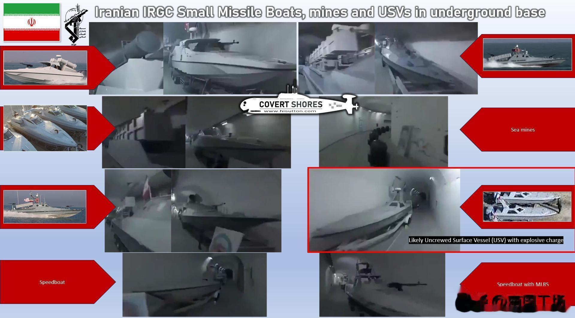 伊朗海军,伊朗革命卫队海军还有千艘突击快艇,导弹艇,鱼雷艇等,藏在地下基地和山体之内