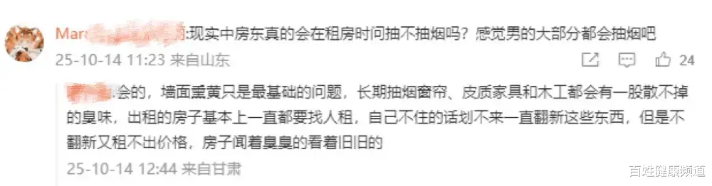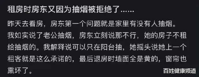 近期,有网友发帖求助,“房东因自己的伴侣有抽烟习惯而谢绝出租,怎么办?”帖子引起众多网友讨论。不少网友表示自己也被房东询问过是否抽烟,还有的认为应当尊重房东的合理要求,因为许多房东表示墙面会因为长期抽烟变黄,窗帘、皮质家具也会有一股难以散去的味道,这会导致后续难以出租,或花钱重新翻修。其中,有一些网友提到三手烟对身体的危害并不小,所以房东拒绝也是合理的。