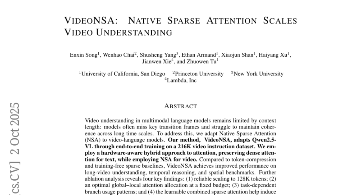 加州大学圣迭戈分校的Song Enxin等研究团队最近发布了一项令人瞩目的研究成果。这篇名为"VideoNSA: Native Sparse Attention Scales Video Understanding"的论文发表于2025年,详细介绍了一种革命性的AI视频理解技术。有兴趣深入了解的读者可以通过论文编号arXiv:2510.02295v1查询完整论文。