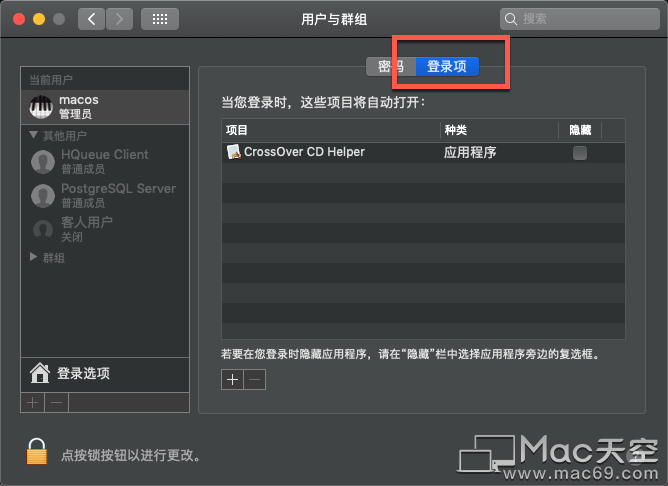 2、打开用户与群组后可以看到如图所示的“登陆项”标签。