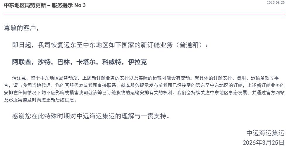 中远海运集装箱运输有限公司(下称“中远海运集运”)恢复远东至阿联酋等一些中东地区国家的新订舱业务。3月25日,中远海运集运发布公告称:“即日起,我司恢复远东至中东地区如下国家的新订舱业务(普通箱):阿联酋,沙特,巴林,卡塔尔,科威特,伊拉克。”