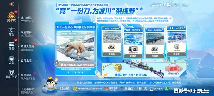 活动时间:12月1日至12月31日结束,活动持续一个月的时间,为感谢全体CFer对CFM电竞公益活动的暖心参与,限时上线一份“冰川回馈礼”。活动任务也是非常的简单,只需要在活动期间完成累计登录,就能直接领取对应的奖励。