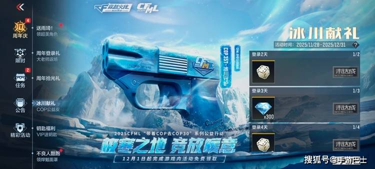 手游巴士(www.shouyoubus.com)2025年12月06日: 哈喽,小伙伴们大家好!十年火线,共筑公益献爱心活动持续进行中。活动期间参与冰川献礼,完成登录任务就能领取超值奖励,更有公益定制皮肤COP 357-冰川守护等你来拿,感兴趣的小伙伴赶紧登录去看看吧。