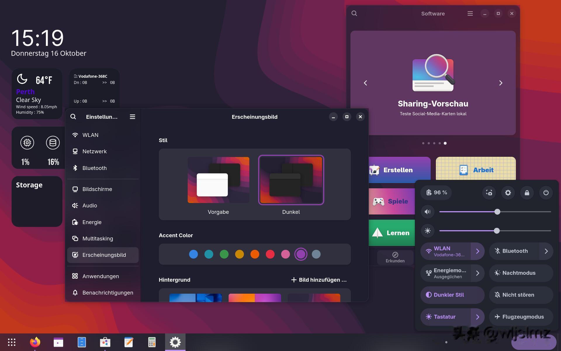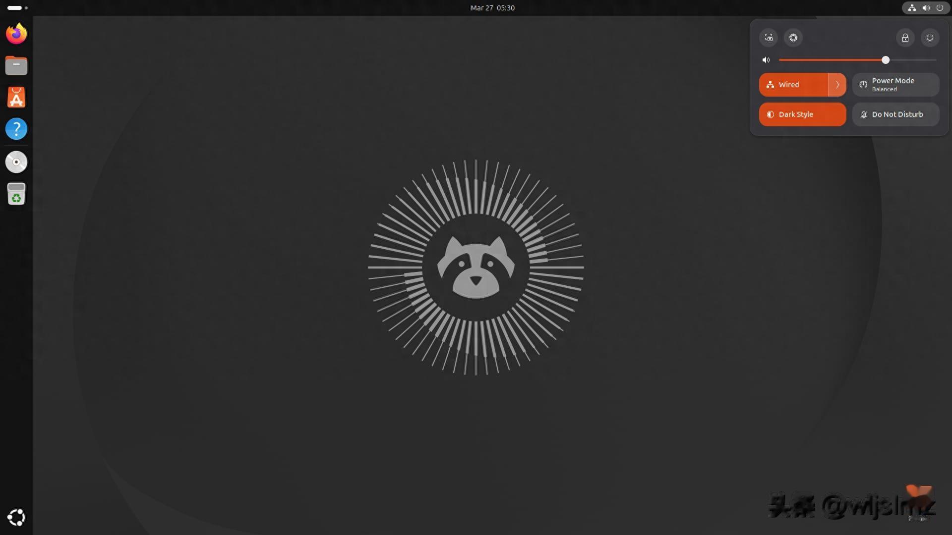 GNOME 50 桌面环境示例,深色模式下界面简洁高效,系统设置面板信息一目了然。这正是 Ubuntu 26.04 默认桌面的基础。