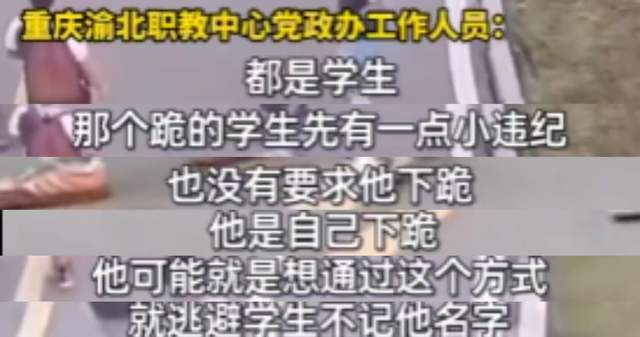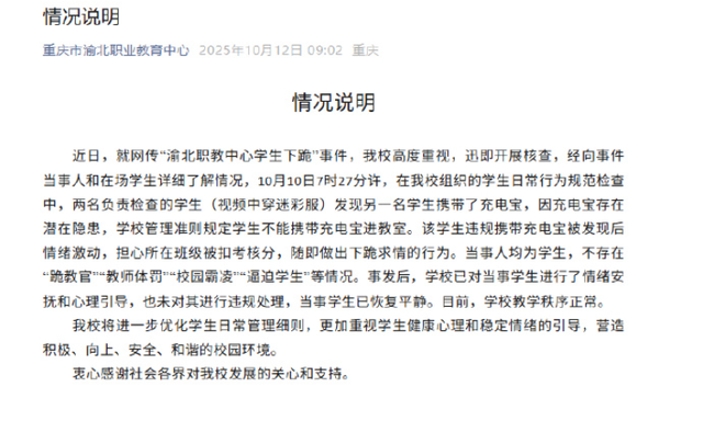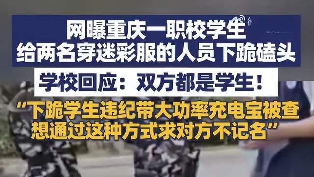 近日,重庆渝北职业教育中心发生的一起学生下跪事件引发社会广泛关注。根据校方通报和多方调查核实,事件起因是一名学生在校园内违规携带大功率充电宝被两名负责安全纠察的同学(身穿迷彩服)发现,因担心班级考核会被扣分而情绪激动,突然向纠察队员下跪求情。