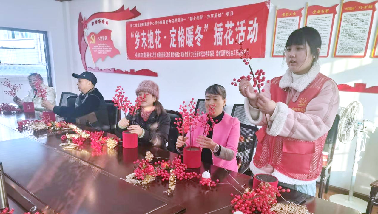 一篮亲手插制的迎新花卉,一次邻里相伴的温馨互动,一场在冬日里如期而至的社区活动。绵阳市涪城区滨江社区举办的“岁末抱花·定格暖冬”插花活动。不仅让15位老年朋友收获了美丽的花艺作品和愉快的上午时光。更以其小而美的实践。为我们如何更好地关爱老年群体、构建老年友好型社区提供了温暖启示。