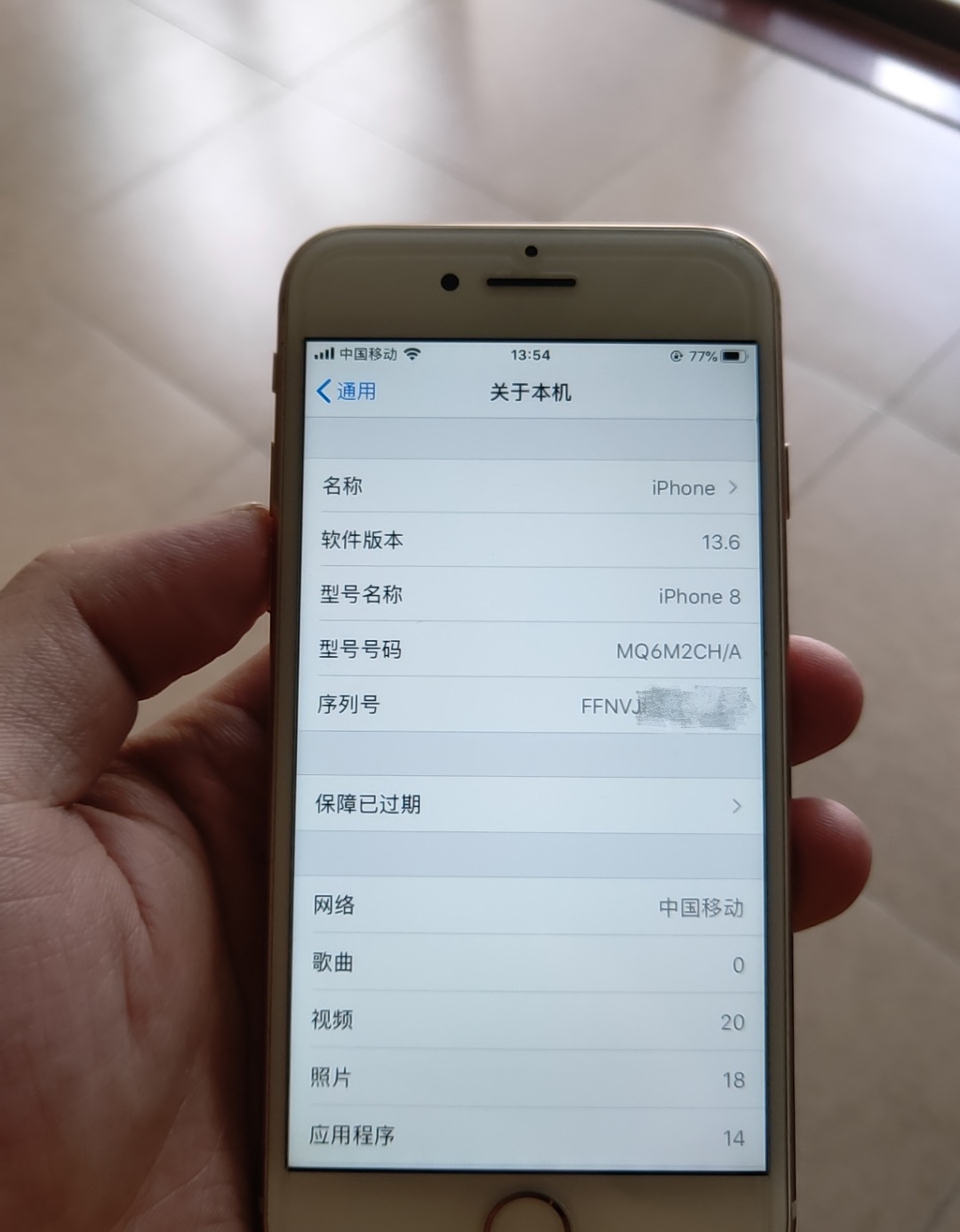通过关于本机显示的数据来看,该机器的确是国行版本的,其他信息显示都正常,但是这里面显示“保障已过期”,这就说明了这台手机不在保修期内了,为什么买到的全新机显示没有保修了呢?接下来我们通过这台手机上的序列号来查询一下,看看显示的结果是什么