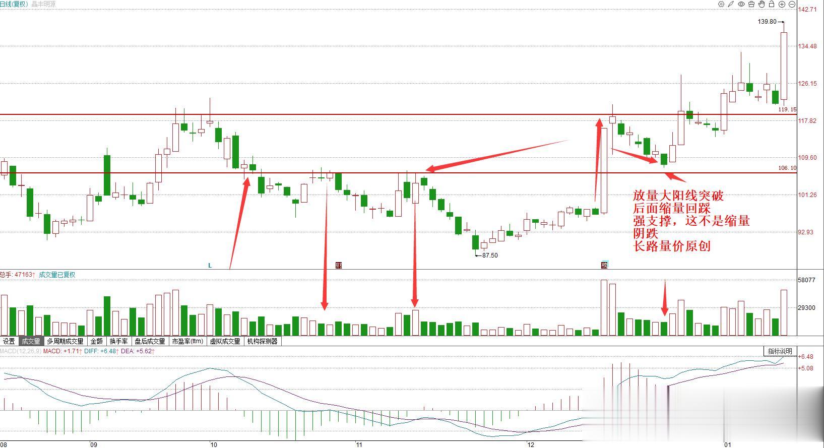 而就是在这种回调的走势中,阴要明显缩量,但是在巨量压力位比较近的时候的阴线缩量是没有什么意义的,而是要在回踩到支撑附近的时候,阴线明显缩量,那么这种缩量才有意义,也只有这种走势才是放量突破缩量回踩,也只有这种走势,后面出现反弹上涨的概率才高,以上都是本人的浅薄的看法,仅供参考。