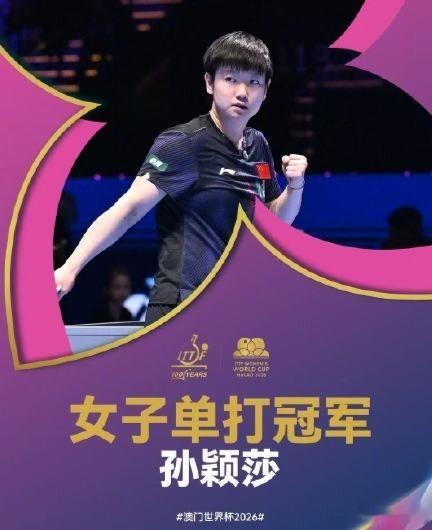 2026国际乒联单打世界杯在澳门银河综艺馆继续进行,在女单决赛中,卫冕冠军、世界第一孙颖莎状态神勇,11-9/11-8/13-11/8-11/11-7总分4-1击败2号种子王曼昱,成功夺得本届赛事女单冠军,也是个人继2024和2025年后连续三年夺冠,创造了这项赛事历史纪录。