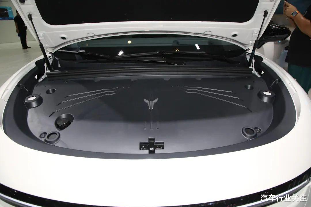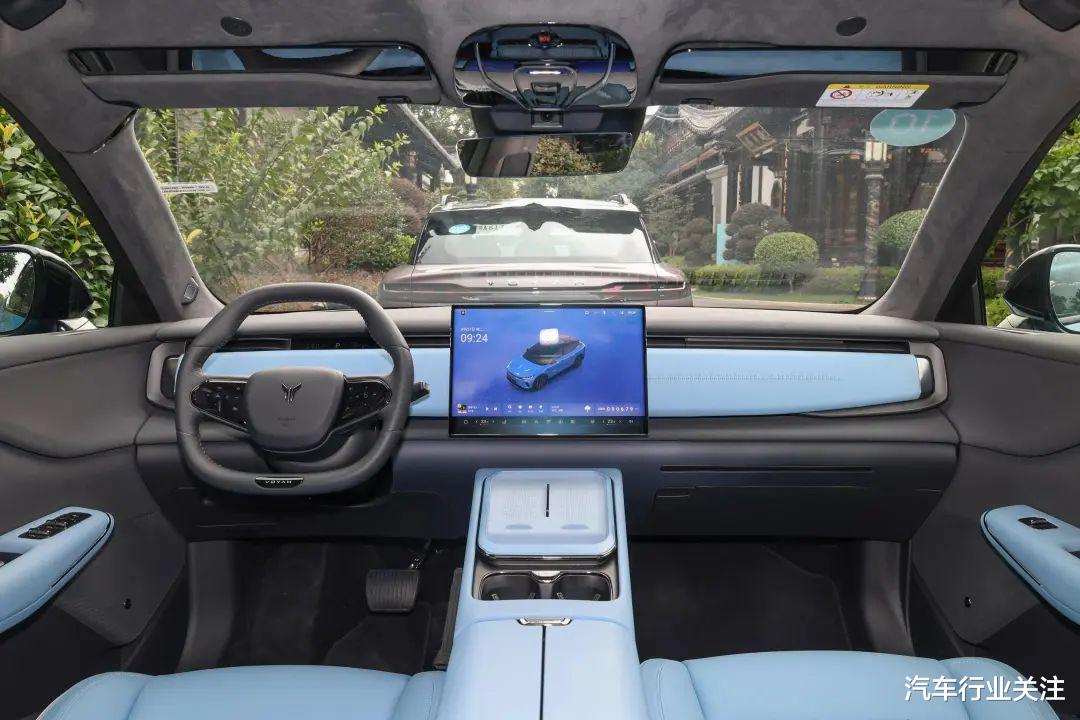 内饰部分,新车采用全新设计风格,车内使用大量软皮材质包裹,中控仅保留一块大屏,配备15.05英寸OLED曲边滑移屏,内置高通骁龙8295芯片,中控屏可按照需求横移至副驾前方,并采用全新造型多边形双辐方向盘和怀挡式换挡机构,仪表盘内嵌在空调出风口附近,为隐藏式设计,仅能显示基础行车信息,中央扶手处下方是一个较大的储物空间。