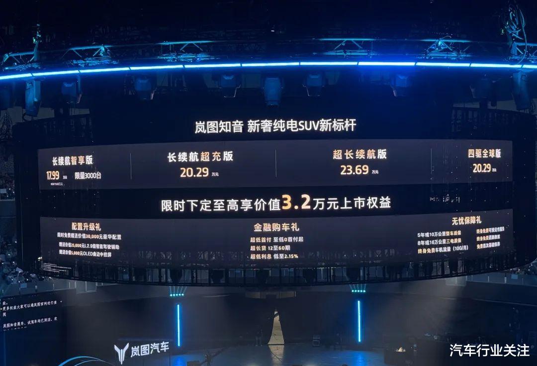 岚图汽车旗下全新纯电车型——岚图知音正式上市。新车共推出4款车型,售价区间为19.69-23.69万元,其中,长续航智享版限量优惠价17.99万元,限量3000辆;长续航超充版售20.29万元;超长续航版售23.69万元;四驱全球版售20.29万元。