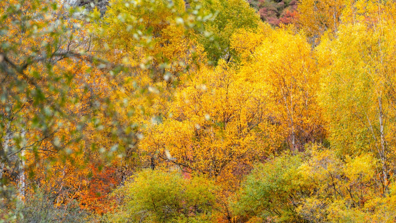 松坪沟的彩林从山脚到山顶层层叠叠,色彩斑斓绿的、黄的、红的、橙的各种颜色交织在一起构成了一幅美丽的画卷