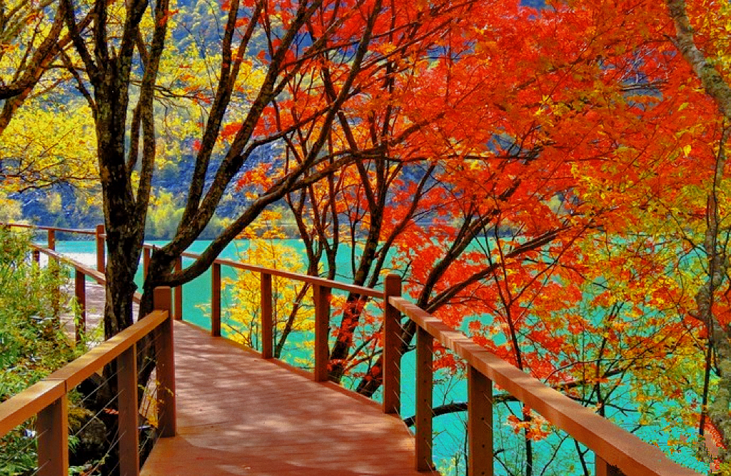彩林、湖泊、瀑布
