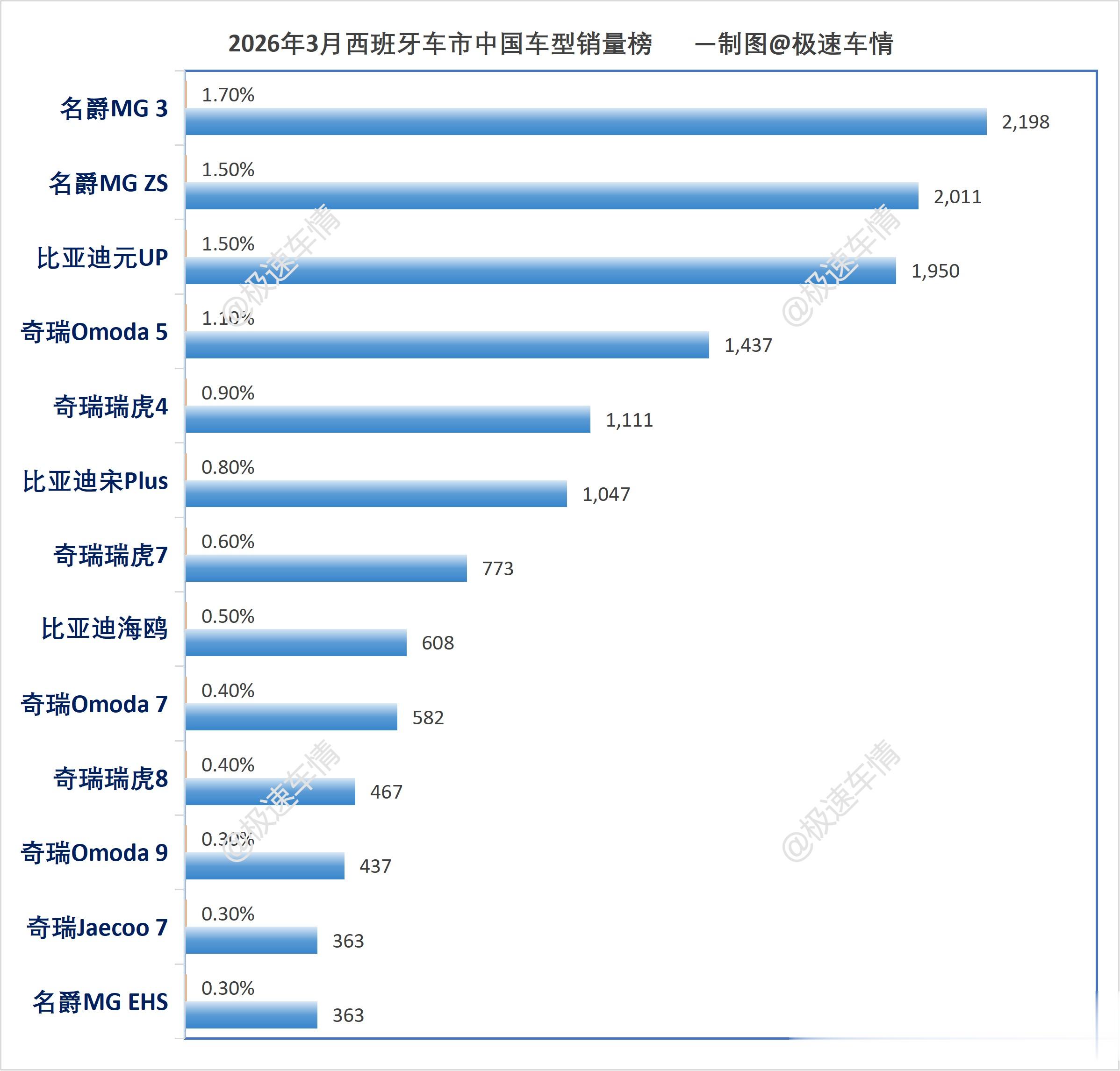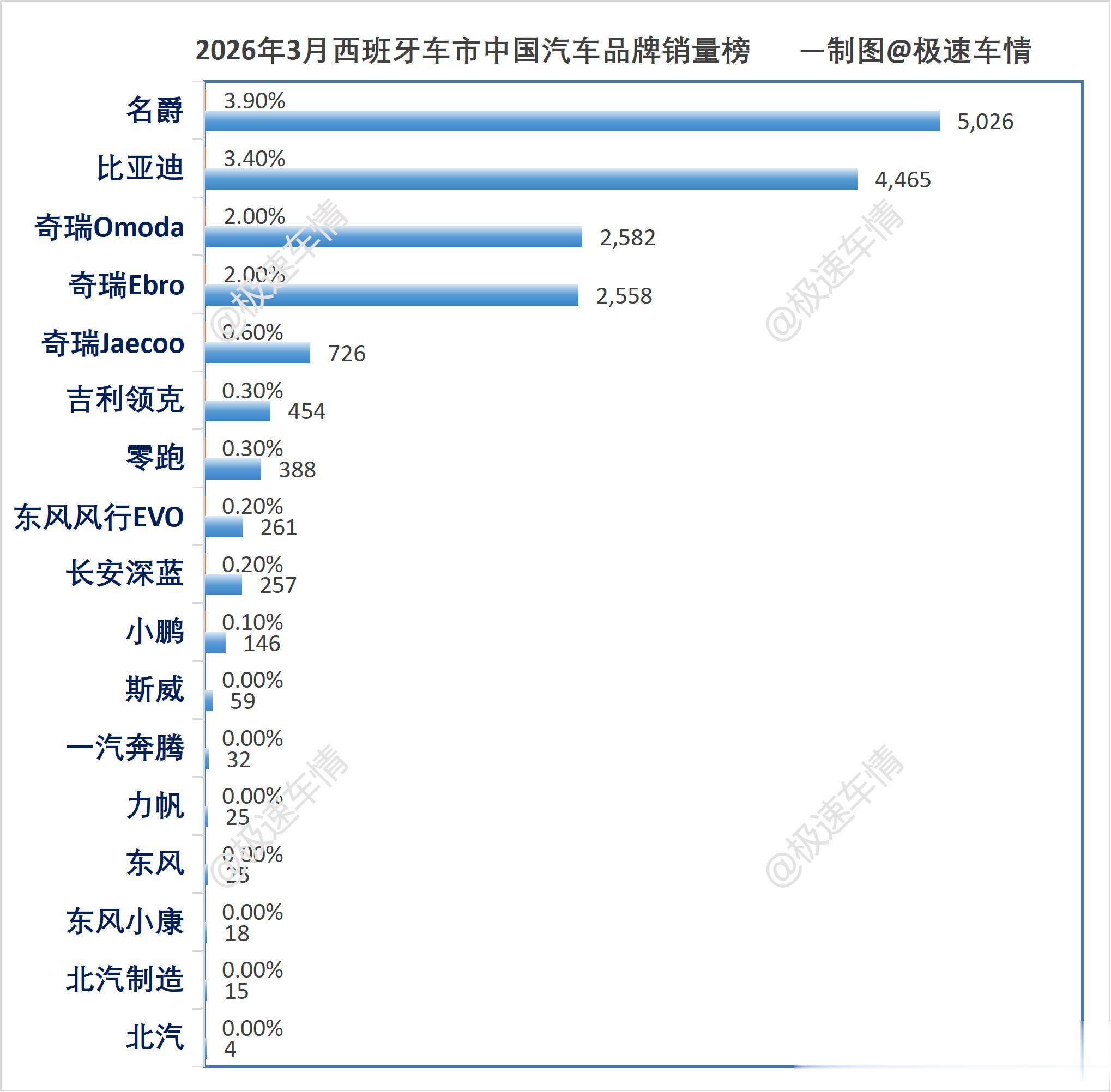 大家好,这里是极速车情。今天为大家带来西班牙汽车市场2026年度3月份中国车企的销量数据报告。
