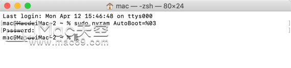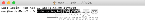 如果要恢复自动开机功能,命令改为 sudo nvram AutoBoot=%03 即可。