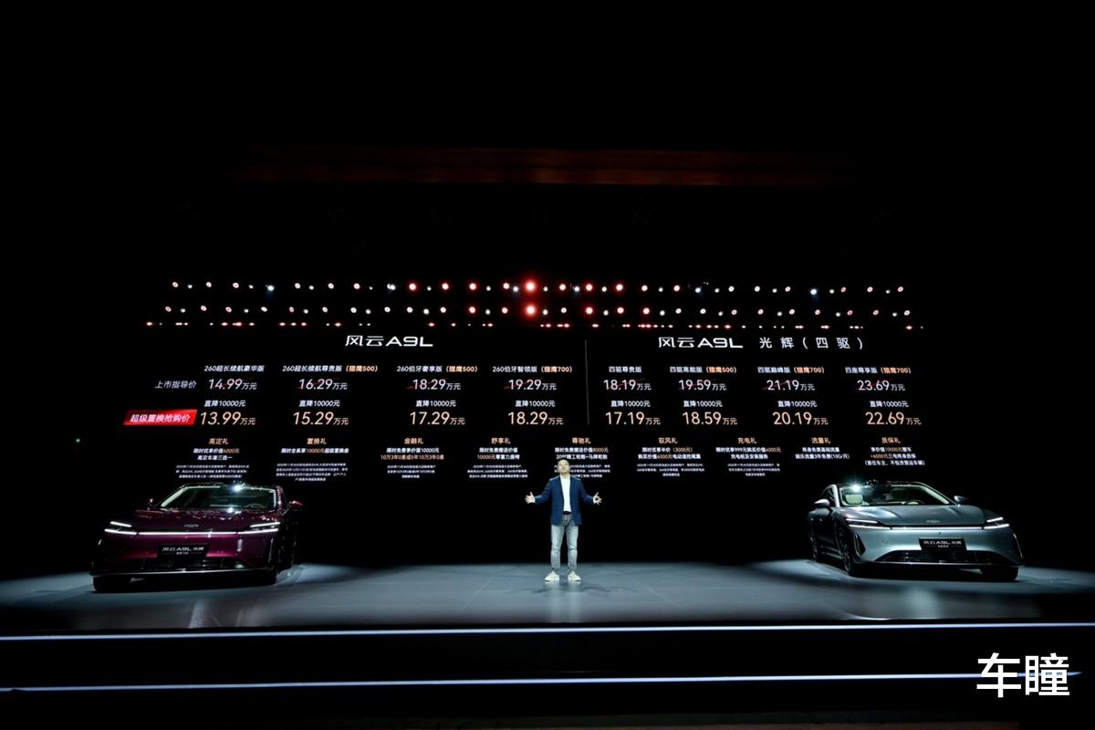 2025年11月15日,"进化"风云A9L光辉(四驱)全球上市发布会在重庆广阳岛国际会议中心隆重举行,本次上市共推出四款版型,正式售价为17.19万元起,共推出四个版本车型,其中四驱尊贵版售价17.19万、四驱高能版(猎鹰500)售价18.59万、四驱巅峰版(猎鹰700)售价20.19万、 四驱尊享版(猎鹰700)售价22.69万。并同步推出"九大购车权益",涵盖高定、置换、金融、舒享、尊驰、驭风、充电、流量、质保多重礼遇,为中国豪华汽车市场再次立下全新标杆。