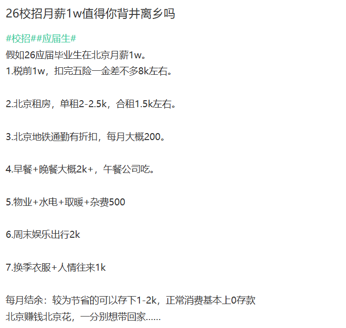 近日,一条帖子引发热议:拿到北京月薪1万的offer,本以为实现了经济独立,但在支付房租、通勤、餐饮、杂费等一连串开销后,才发现“北京赚钱北京花,一分也别想带回家”。