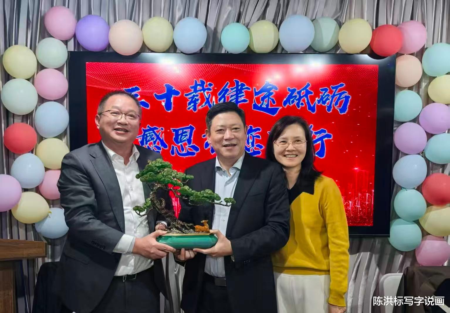 ▲图为既是师徒又是朋友,做过20多年同事、浙江腾智律师事务所主任朱智慧代表徒弟们赠送吉祥鸿运艺术品。