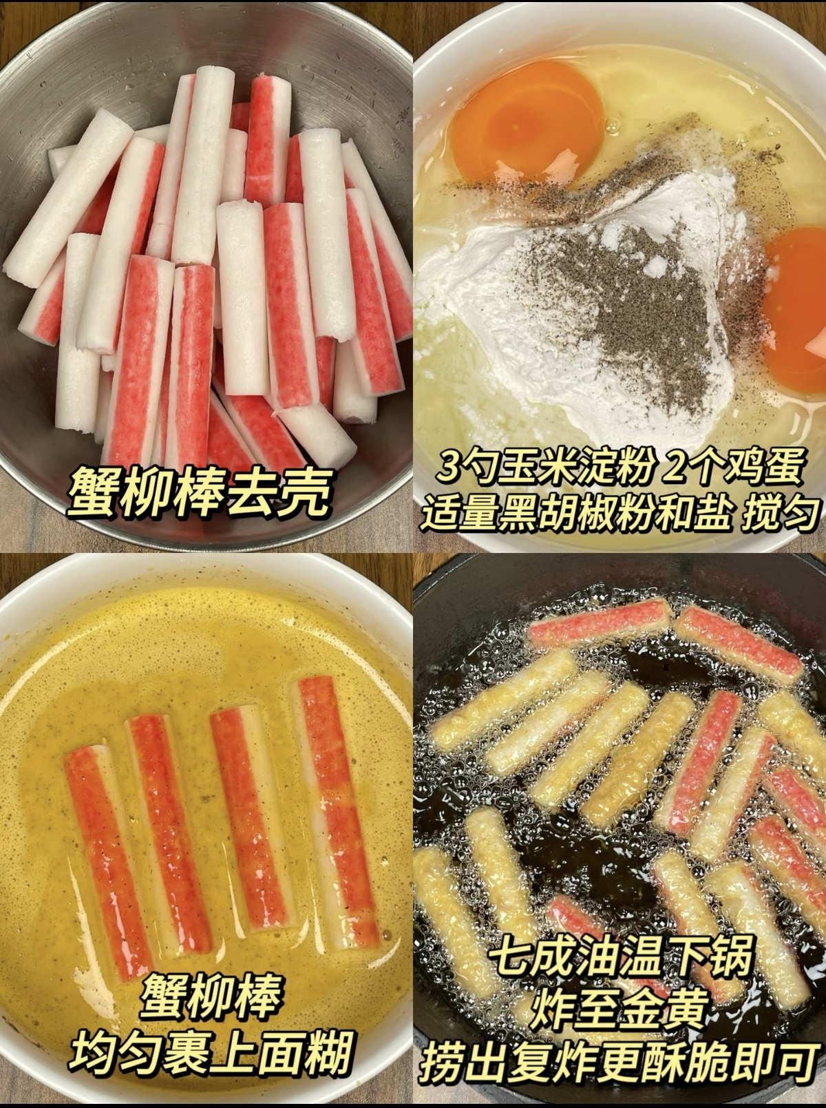 当热气腾腾的香炸蟹肉棒端上桌,金黄的外皮,散发着诱人的香气,咬一口,外酥里嫩,蟹肉的鲜美在口中迸发,椒盐和辣椒粉的味道恰到好处,让人回味无穷。这道菜不仅味道好,而且制作简单,无论是作为家常菜,还是招待朋友,都是绝佳的选择。每次我做这道菜,家人和朋友都会赞不绝口,连隔壁的小孩都会被香味吸引过来,眼巴巴地看着,馋得直流口水。这道香炸蟹肉棒,不仅是一道美食,更是一种家的味道,一种温暖的记忆。