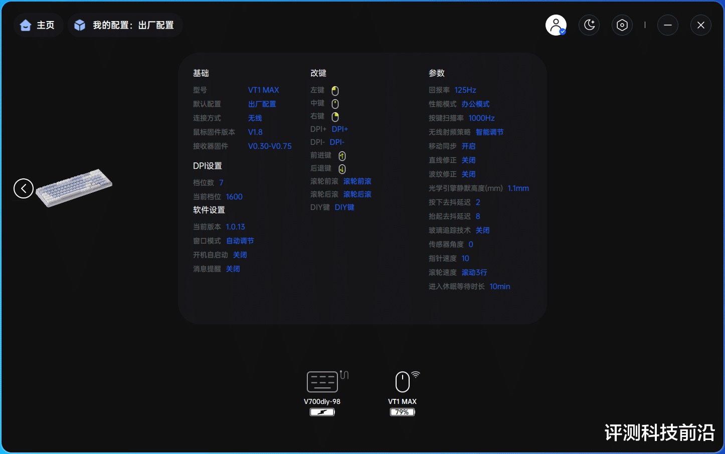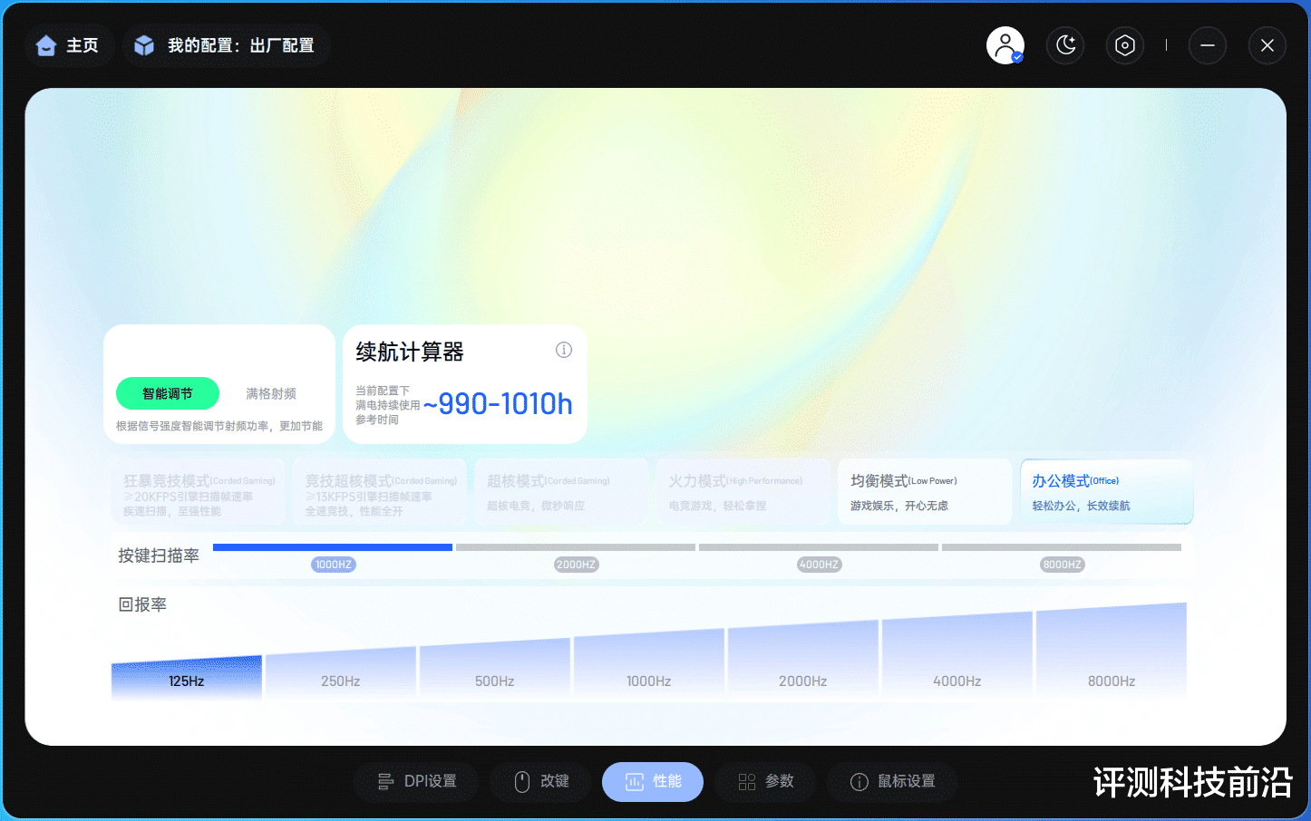 ▼性能页面里的模式切换功能是这次VT二代都具备的,可根据信号强度自动调节射频功率以延长续航时间或开启信号满功率运行;VT1系列开启狂暴竞技模式后,具备≥20000FPS全段固定疾速扫描性能,火力全开,满电状态的VT1 MAX在打开狂暴竞技模式+8000Hz回报率+8000Hz的按键扫描率+满格射频的最强最快的模式拉满下,依然能有75小时的续航!最低功耗状态能达到990~1010小时的续航时间。雷柏是目前唯一一家同时具备最高性能竞技固件和自适应调节功耗的厂家,支持根据启动不同的应用程序,自动切换对应的模式,非常好用。