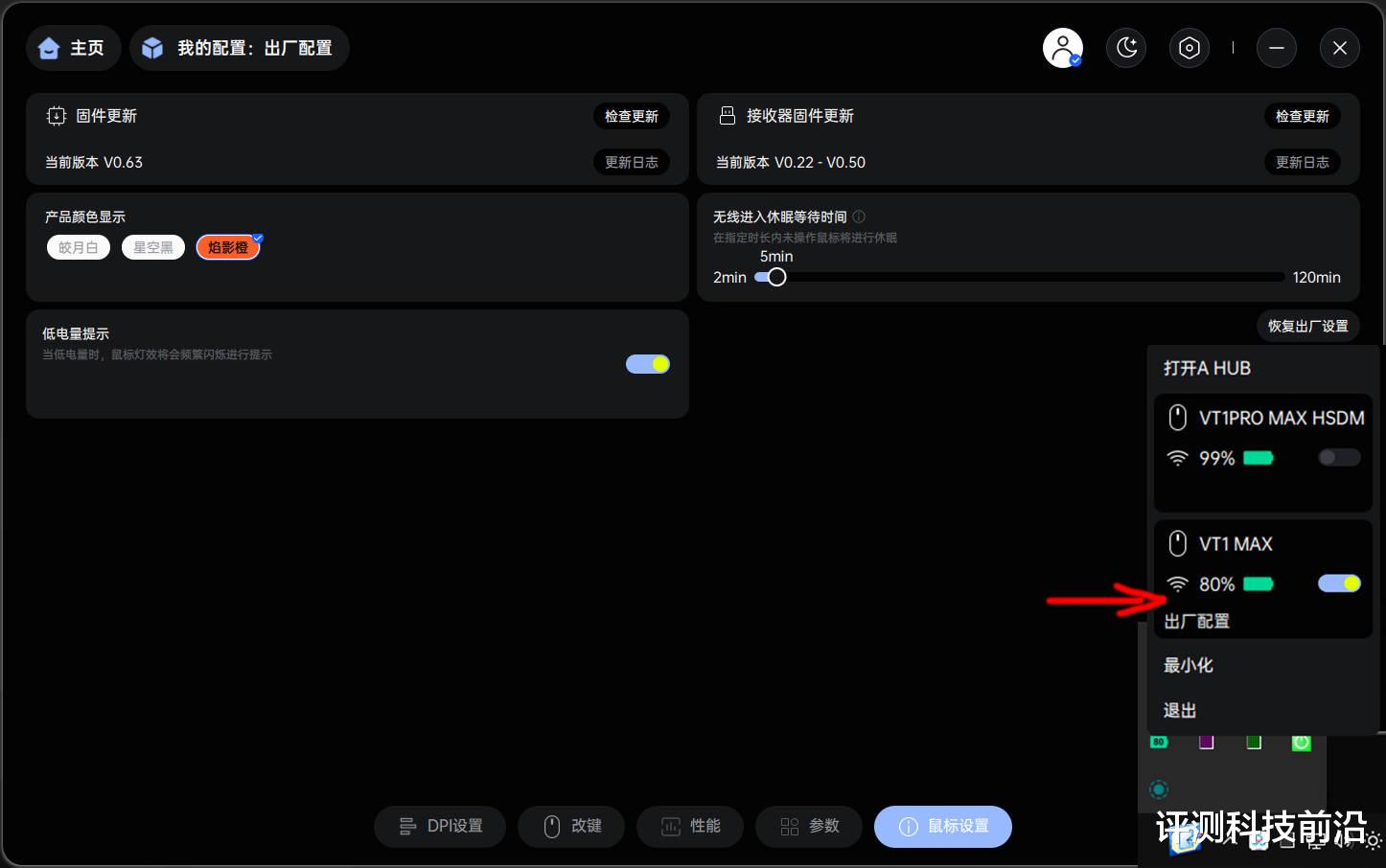 ▼最后的鼠标设置里可以切换驱动显示的鼠标颜色,还能调节休眠时间,驱动右上角设置进去能开启在系统右下角显示电量指示图标,很不错的小设计