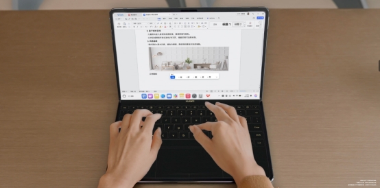 用户使用华为MateBook Fold 非凡大师轻松切换多种形态,以满足不同场景的需求:横屏展开态适合桌面办公,提供18英寸沉浸式大屏体验,适合办公、创作、学习、娱乐等各种场景;折叠态下,上下双屏独立运作,支持多窗口并行操作,轻松实现多任务处理;便携移动模式通过磁吸星跃随行键盘实现隐形收纳,极简美学与实用性兼得。
