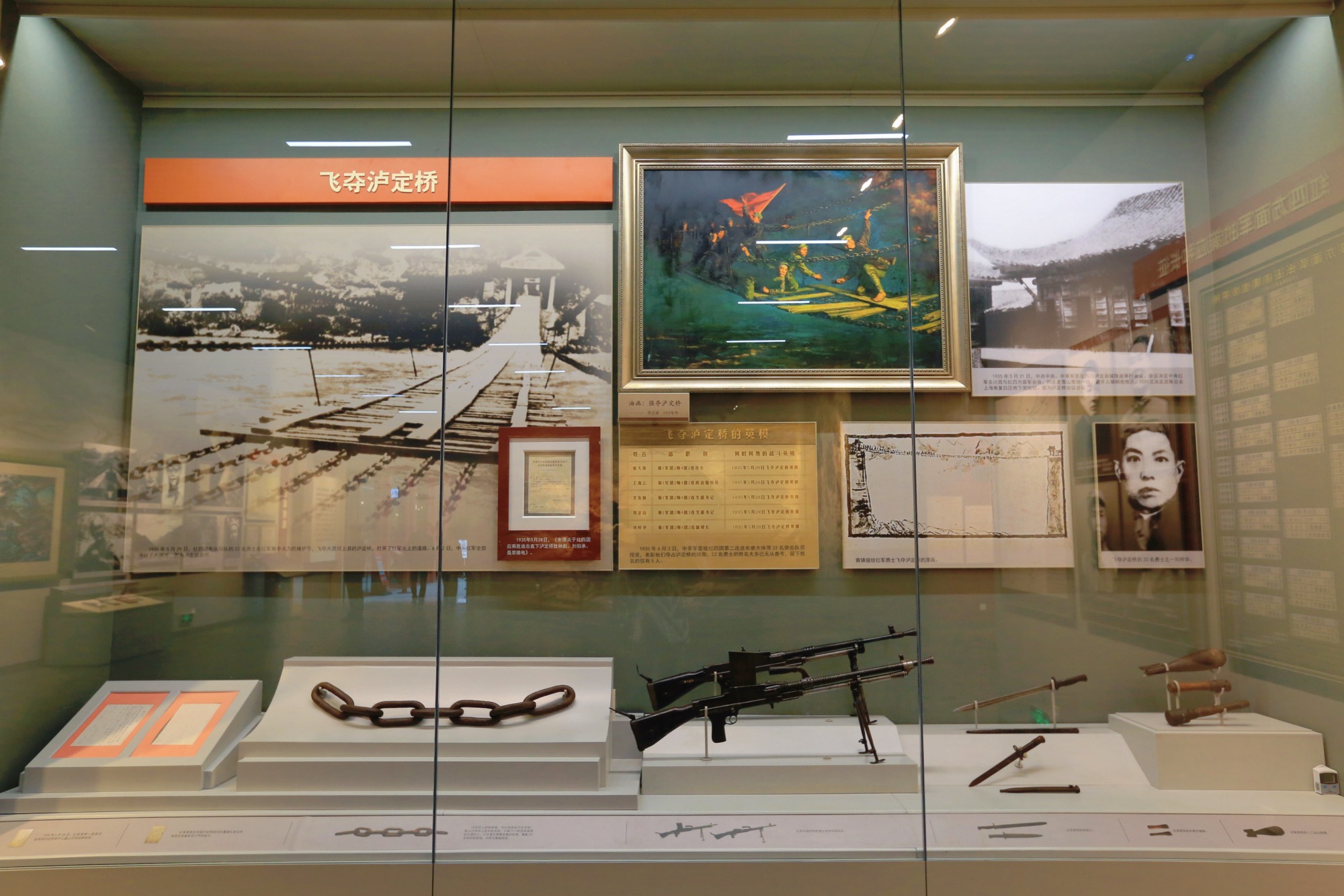 泸定桥实景照片、战斗油画、桥上的铁链、战斗时的枪械整齐陈列在展柜中,作为长征中的关键战役,飞夺泸定桥打破了敌人的围追堵截,是红军转危为安的重要节点。