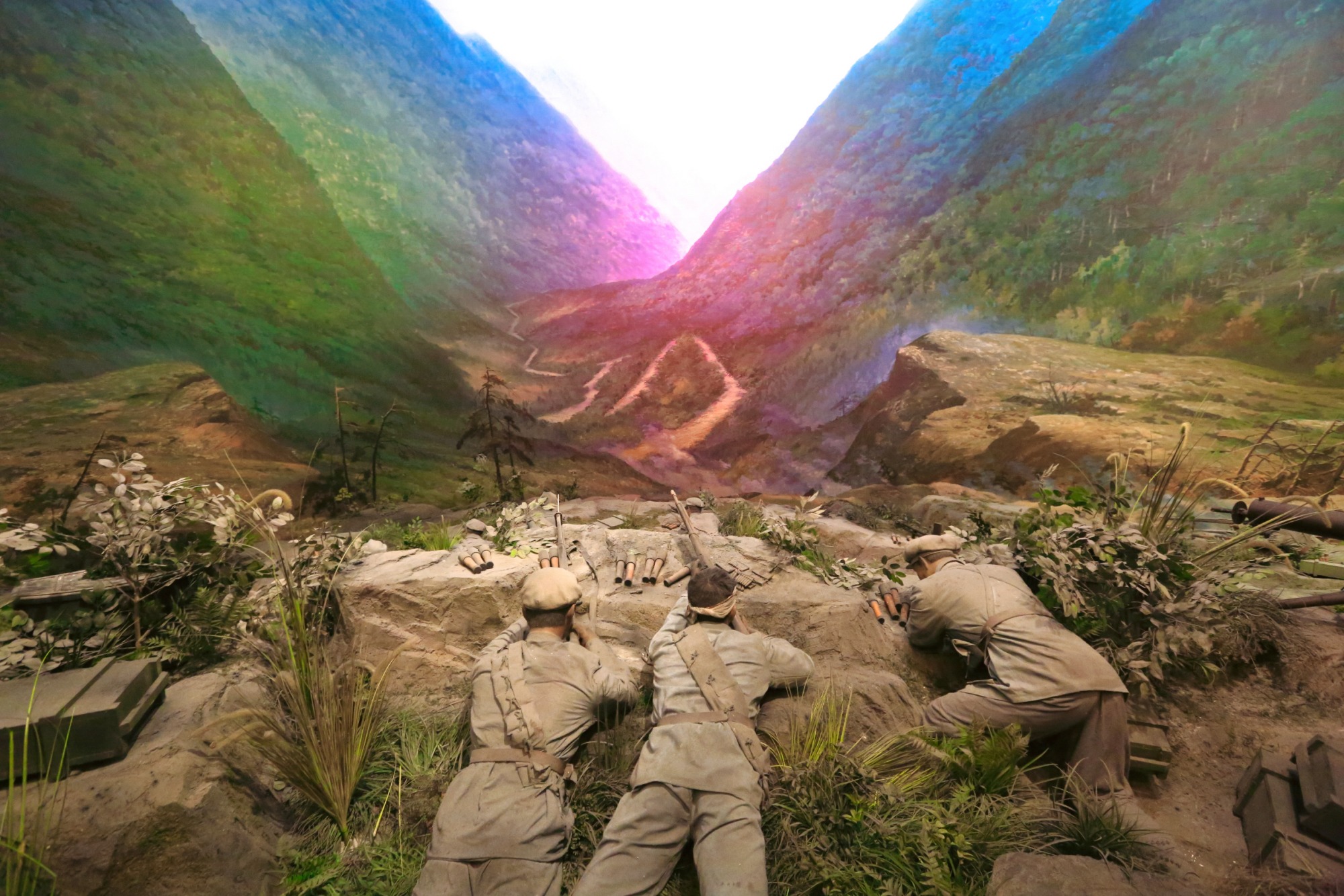 娄山关战斗还原场景中,战士们潜伏在山间,抱着和敌人殊死搏斗的决心严阵以待。这场战斗被列为长征以来首次大捷,“雄关漫道真如铁,而今迈步从头越”就写在战斗之后。
