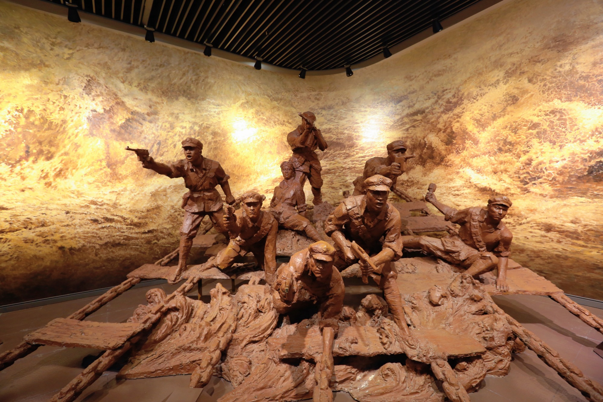曾经在书本上读到的红军飞夺泸定桥的场景通过雕塑和声光电特效生动再现在场馆中,战士们攀着铁索、奋勇冲锋的姿态栩栩如生,身后的激流渲染出作战条件的惊险和战斗的紧张激烈。